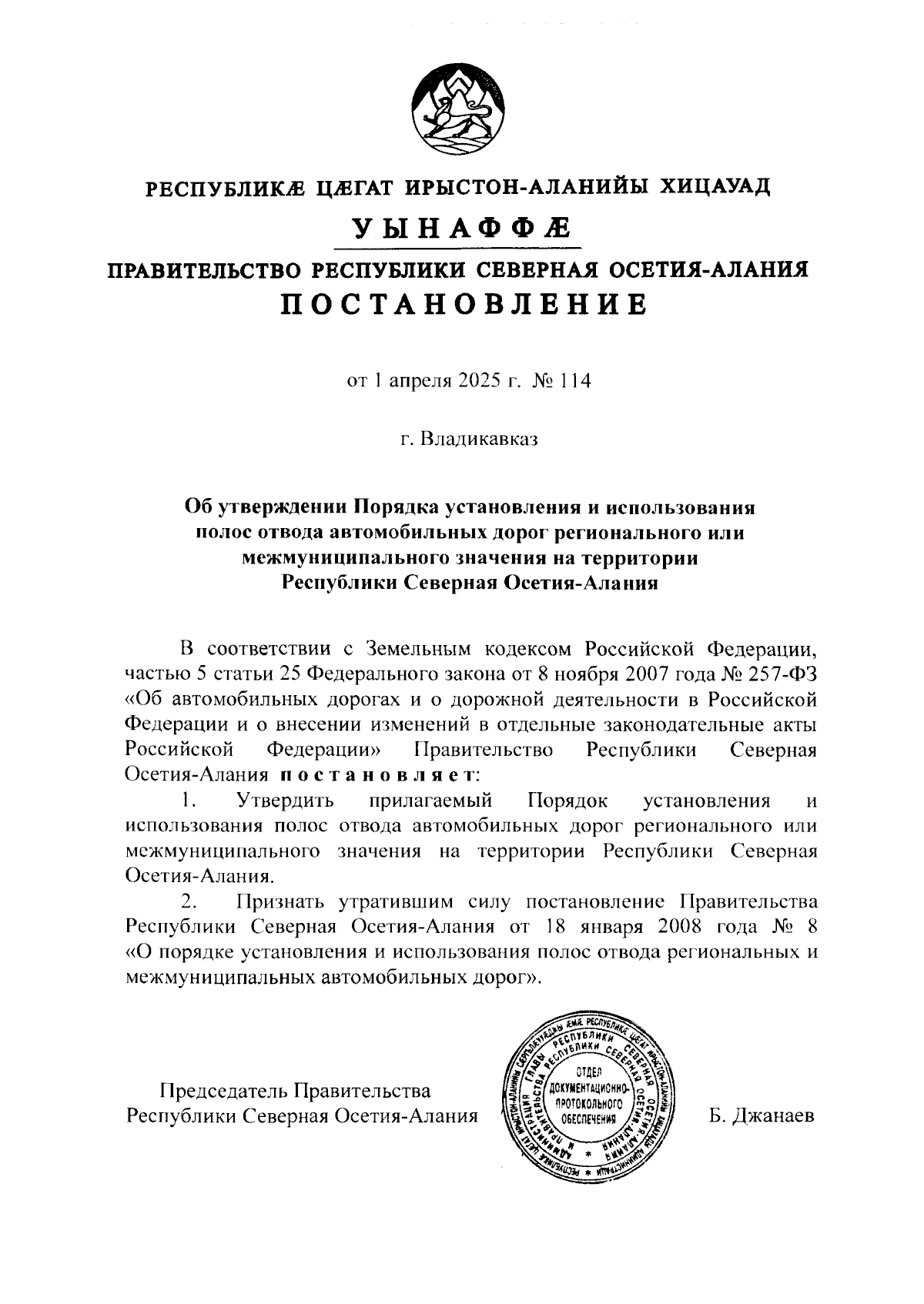 Постановление Правительства Республики Северная Осетия - Алания от 01.04.2025 № 114