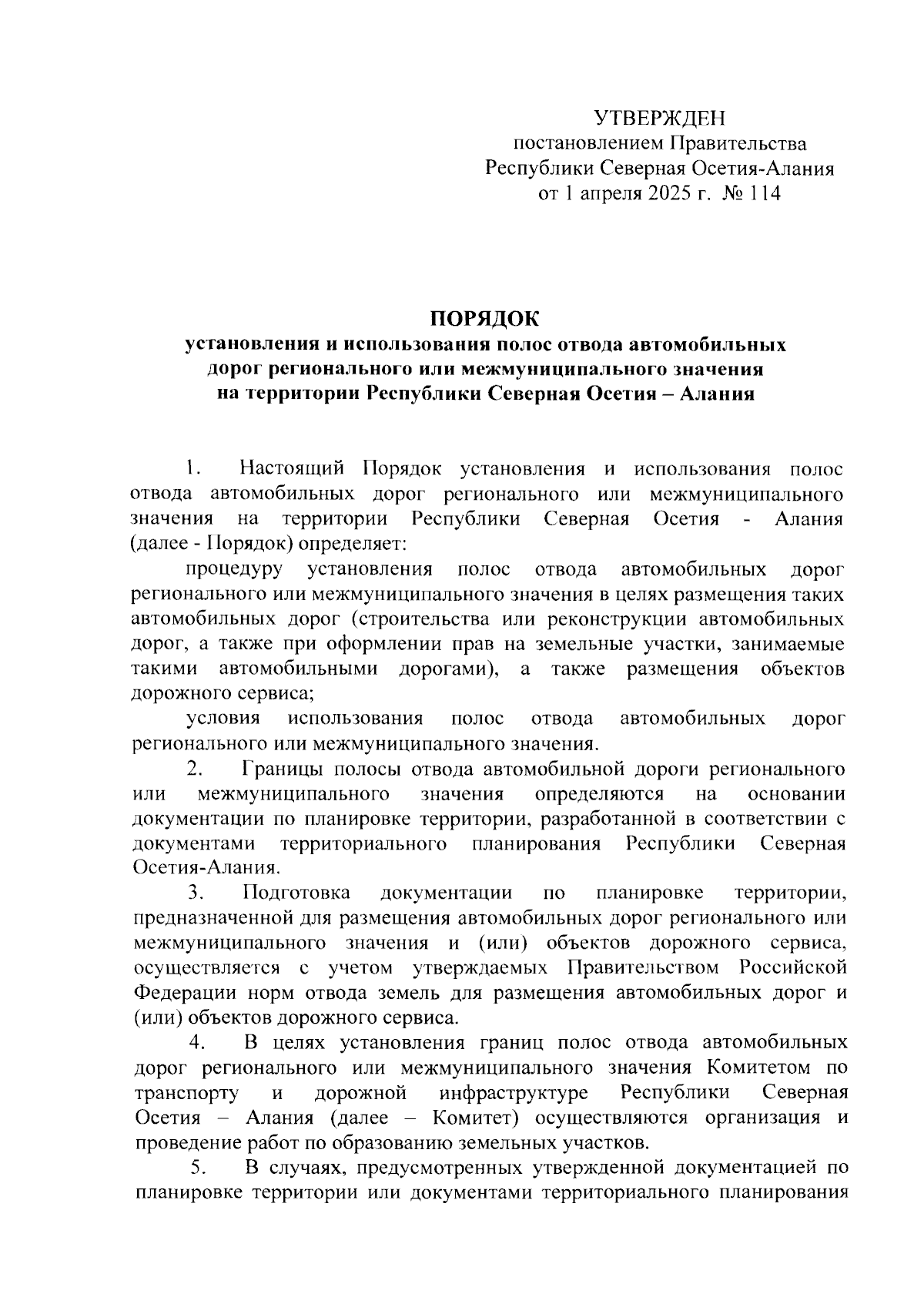 "Об утверждении Порядка установления и использования полос отвода автомобильных дорог регионального или межмуниципального значения на территории Республики Северная Осетия-Алания"