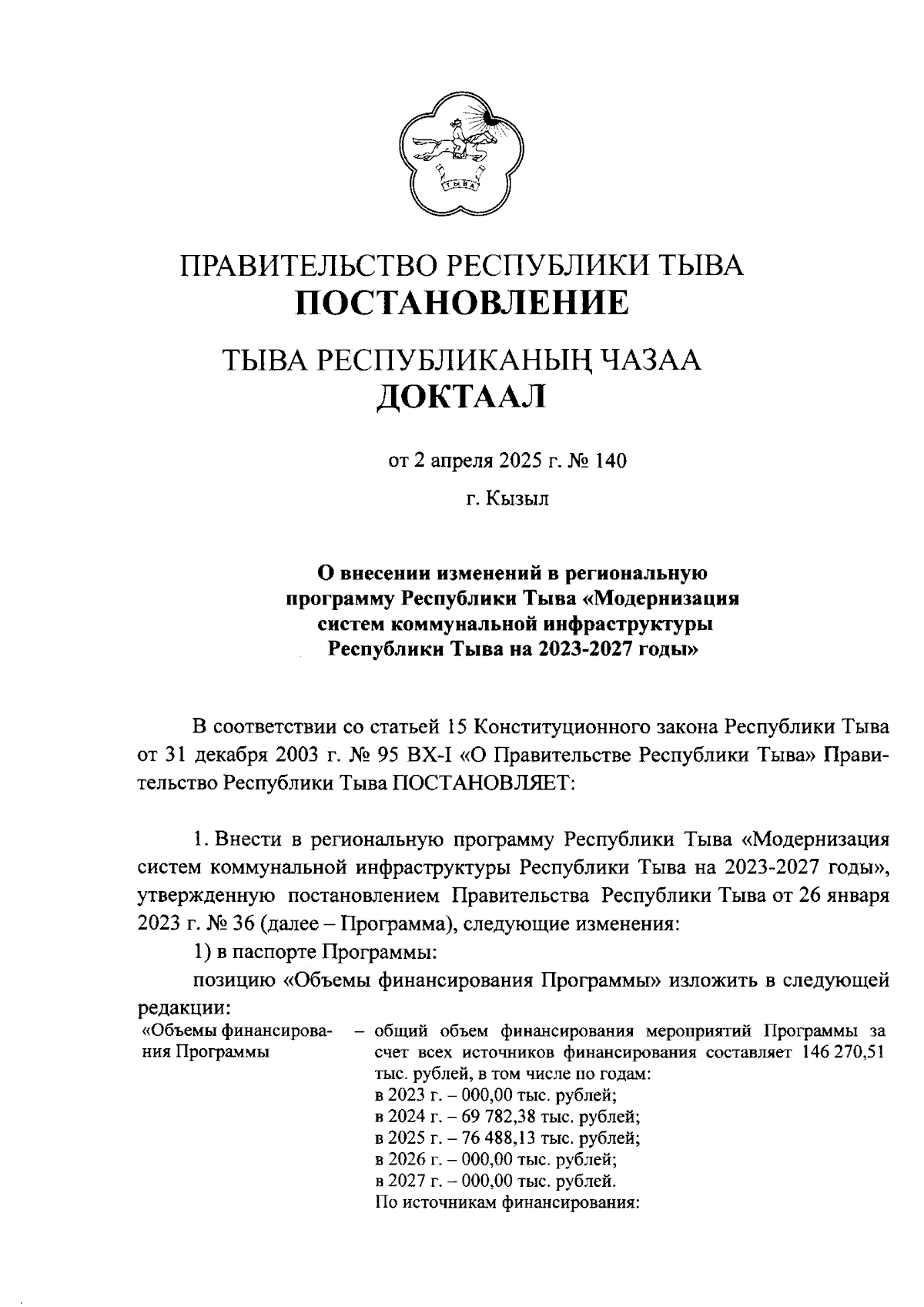 Постановление Правительства Республики Тыва от 02.04.2025 № 140
