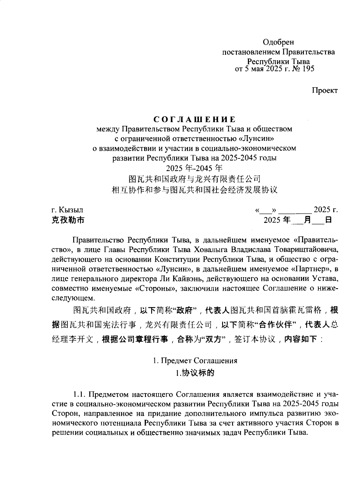 "Об одобрении проекта соглашения между Правительством Республики Тыва и обществом с ограниченной ответственностью "Лунсин" о взаимодействии и участии в социально-экономическом развитии Республики Тыва на 2025-2045 годы"