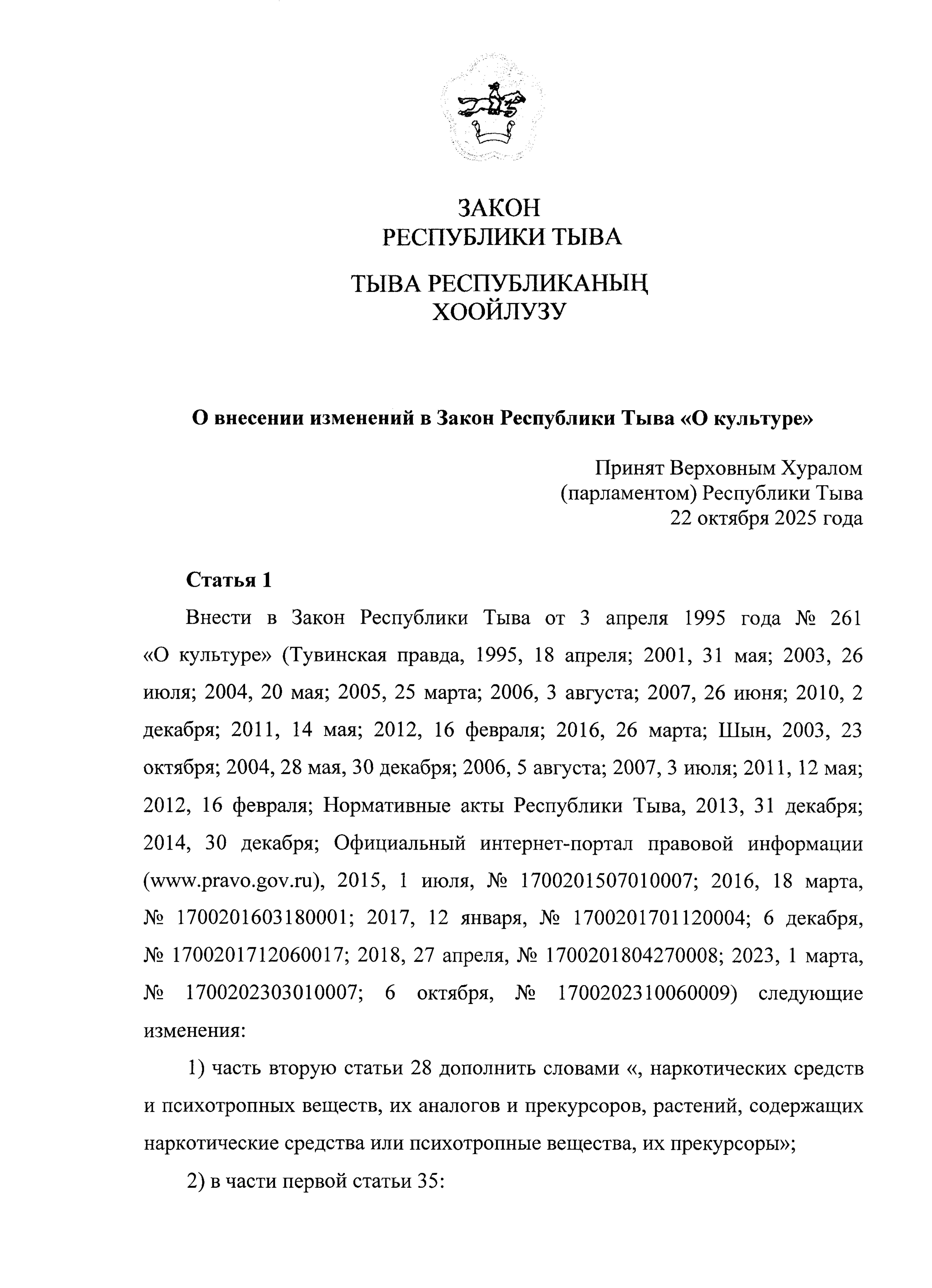 "О внесении изменений в Закон Республики Тыва "О культуре"