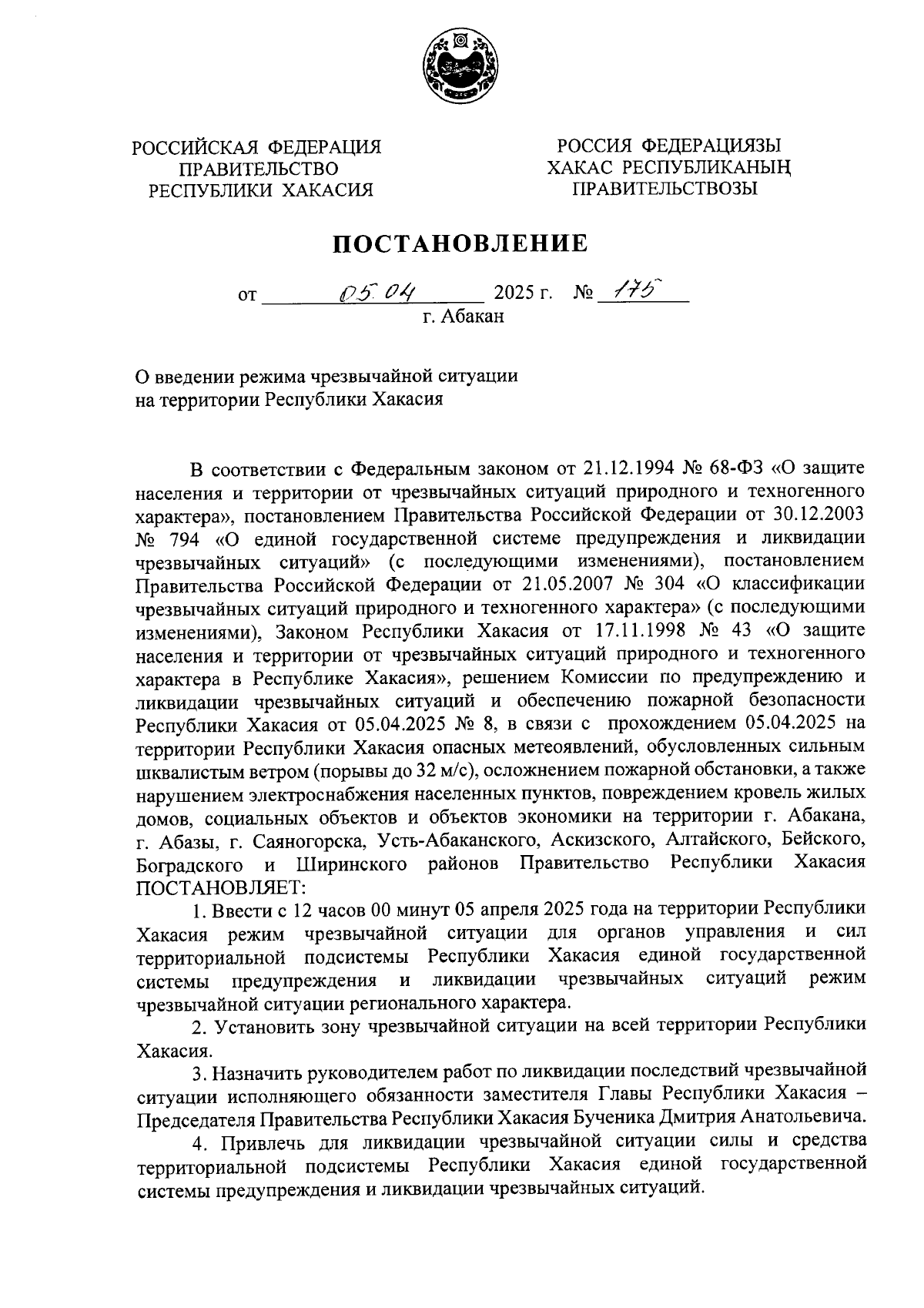 Постановление Правительства Республики Хакасия от 05.04.2025 № 175