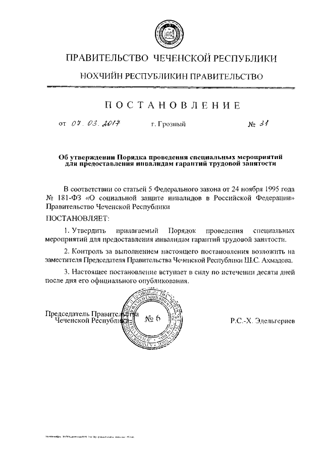 Постановление Правительства Чеченской Республики от 07.03.2017 № 31