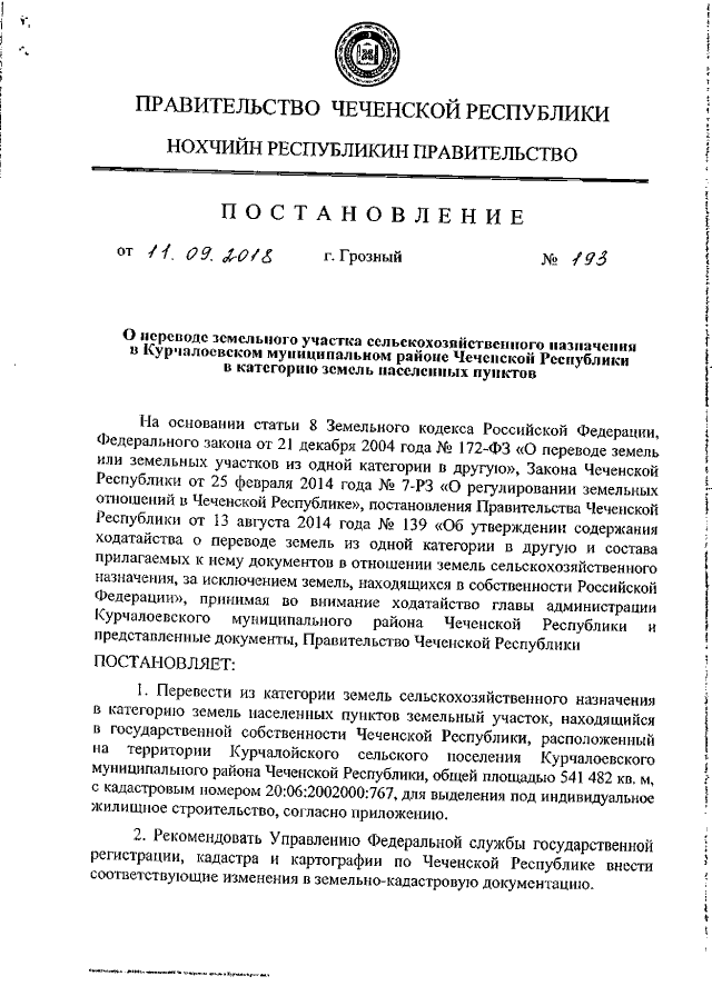 "О переводе земельного участка сельскохозяйственного назначения в Курчалоевском муниципальном районе Чеченской Республики в категорию земель населенных пунктов"