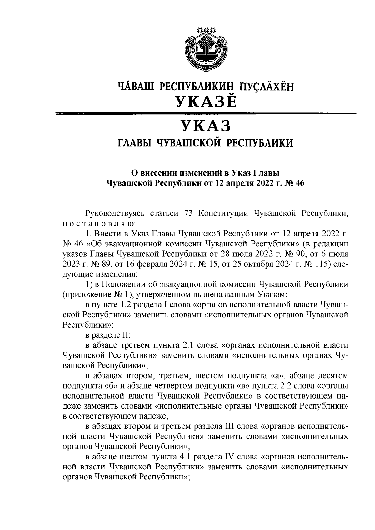 "О внесении изменений в Указ Главы Чувашской Республики от 12 апреля 2022 г. № 46"