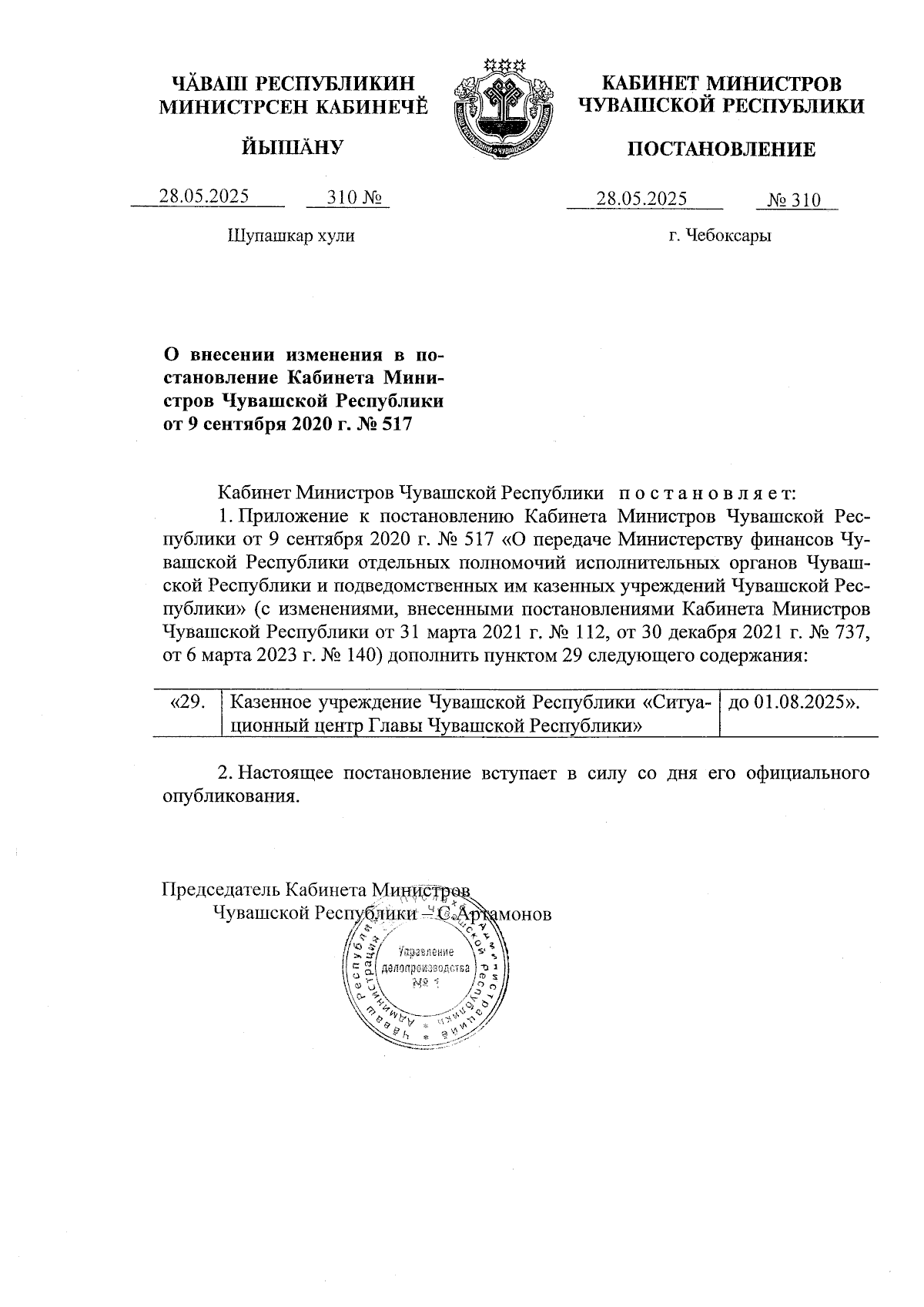 Постановление Кабинета Министров Чувашской Республики от 28.05.2025 № 310