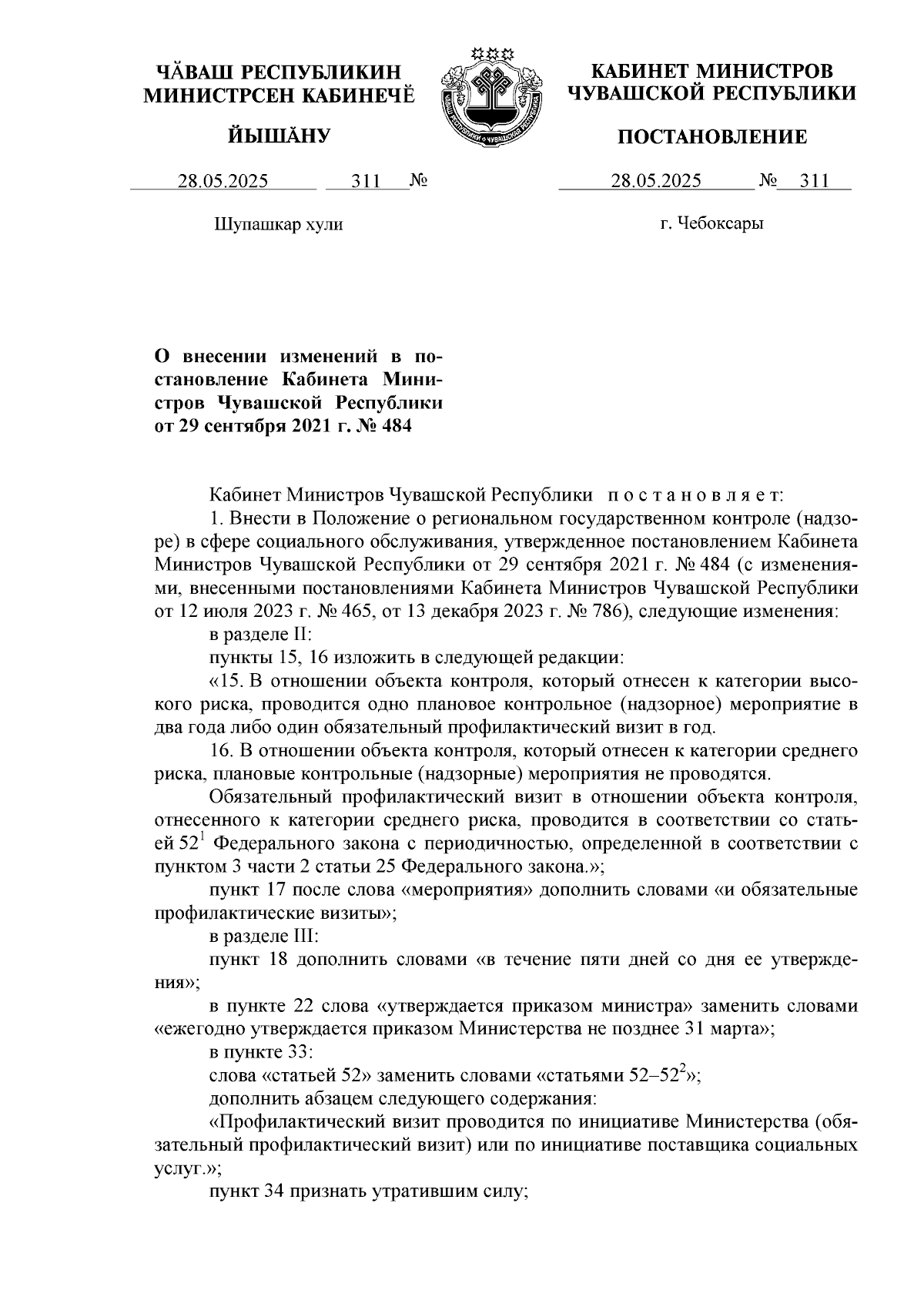 Постановление Кабинета Министров Чувашской Республики от 28.05.2025 № 311