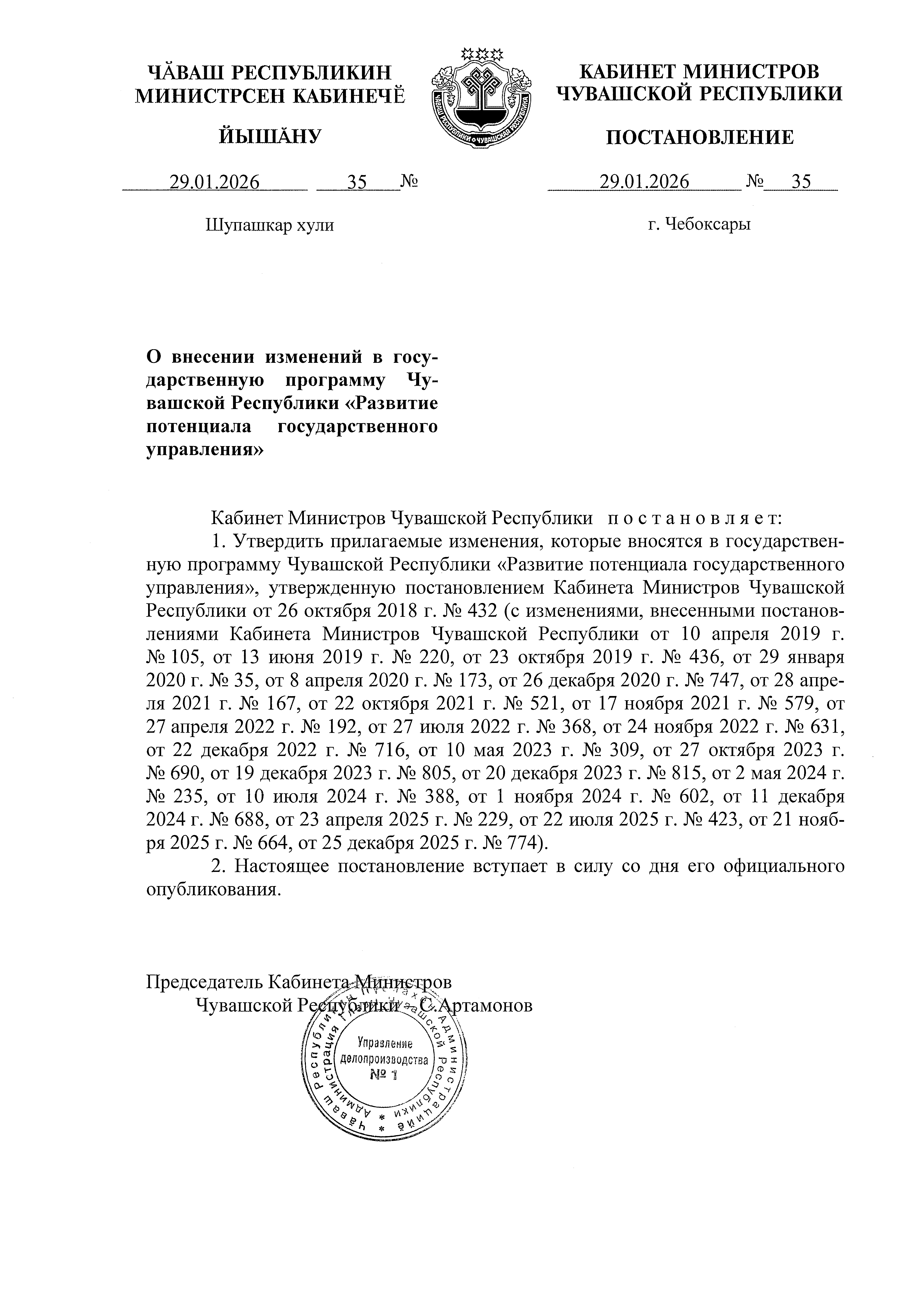Постановление Кабинета Министров Чувашской Республики от 29.01.2026 № 35