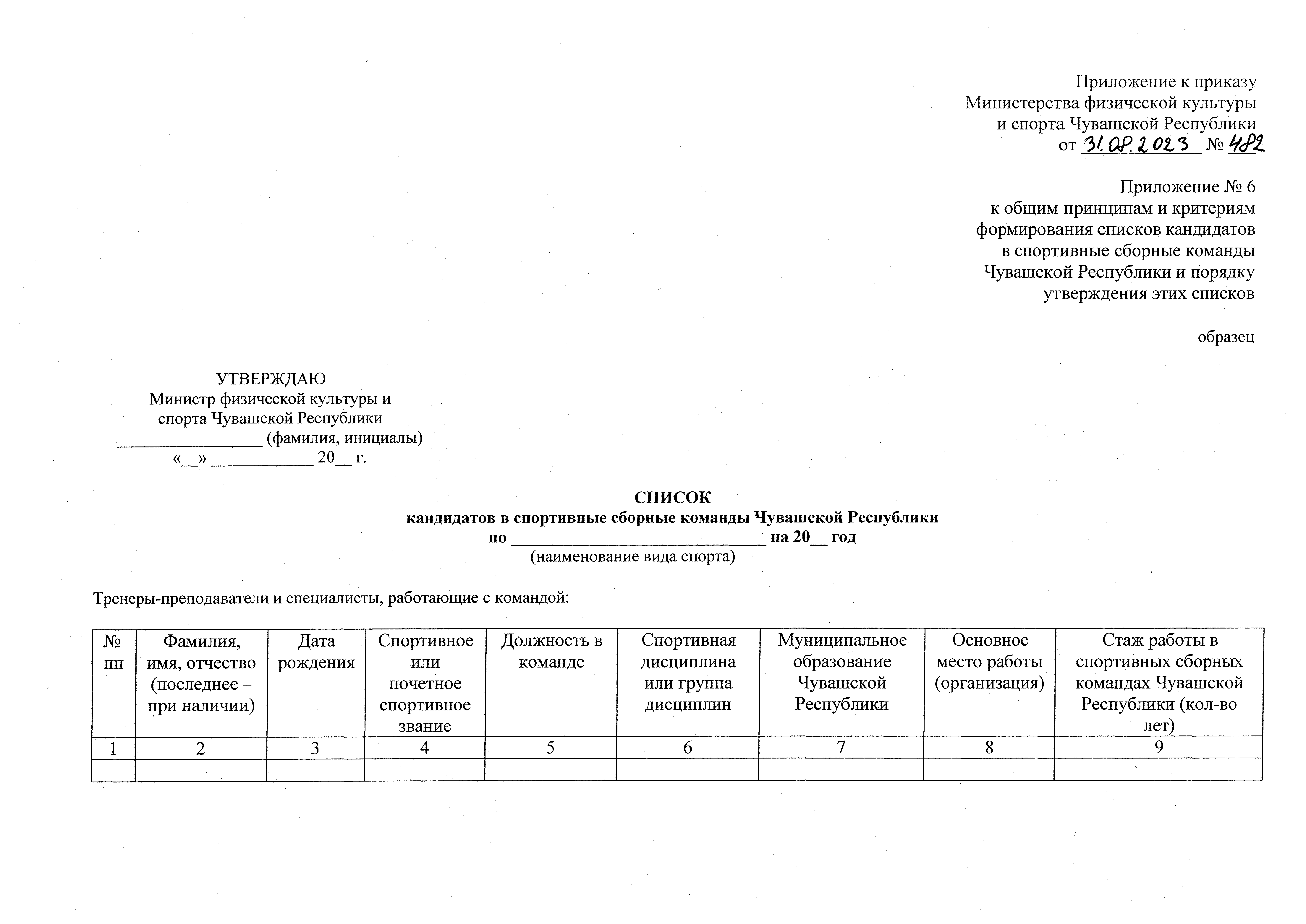 Приказ Министерства физической культуры и спорта Чувашской Республики от 31.08.2023 № 482