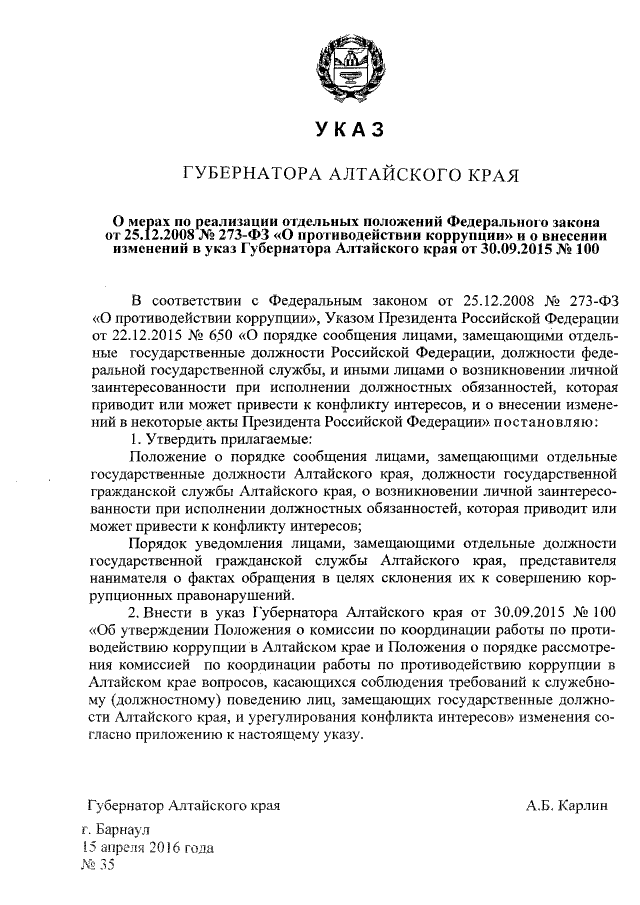 Указ Губернатора Алтайского края от 15.04.2016 № 35