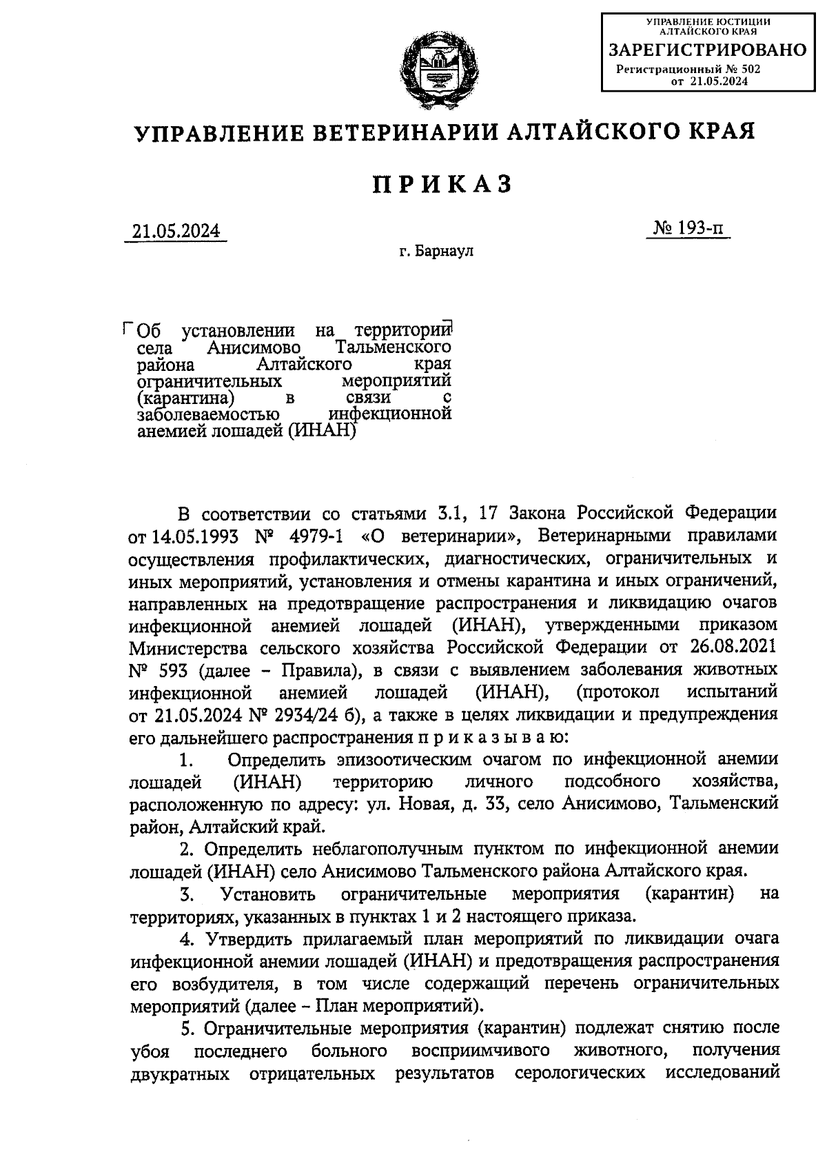 Приказ Управления ветеринарии Алтайского края от 21.05.2024 № 193-п