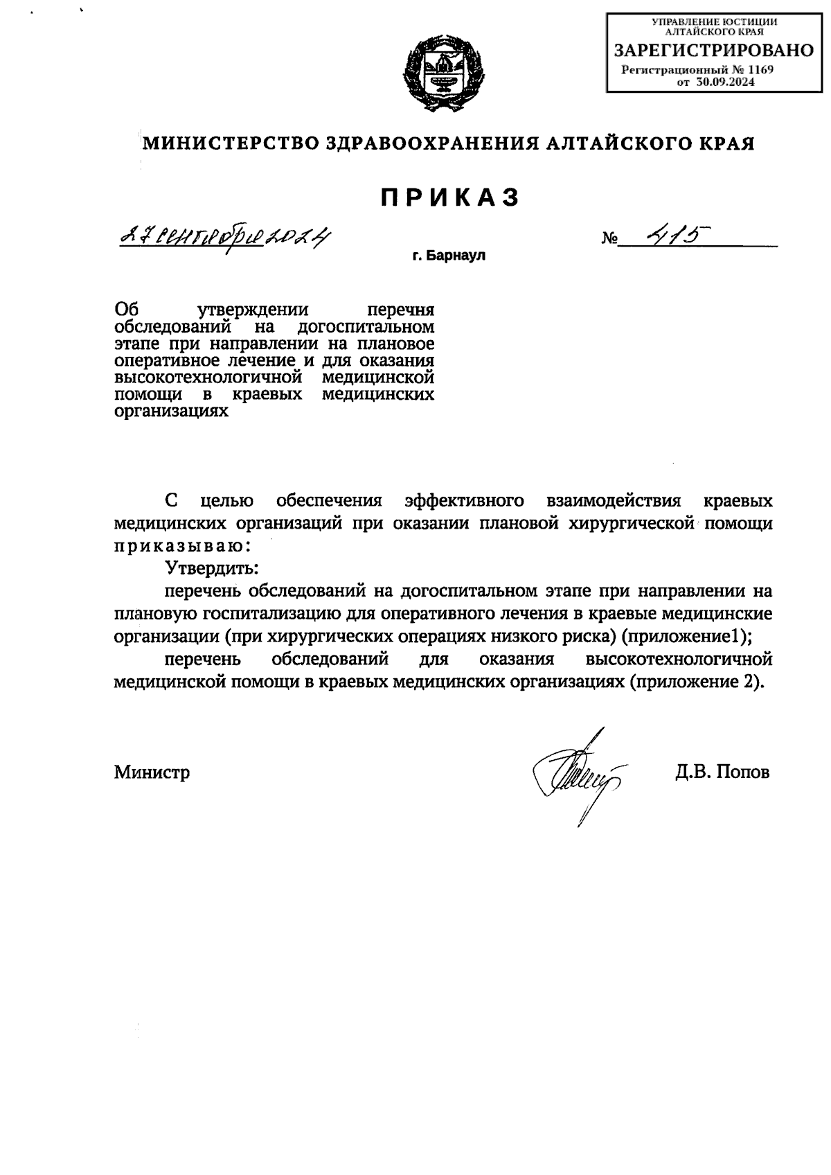 Приказ Министерства здравоохранения Алтайского края от 27.09.2024 № 415