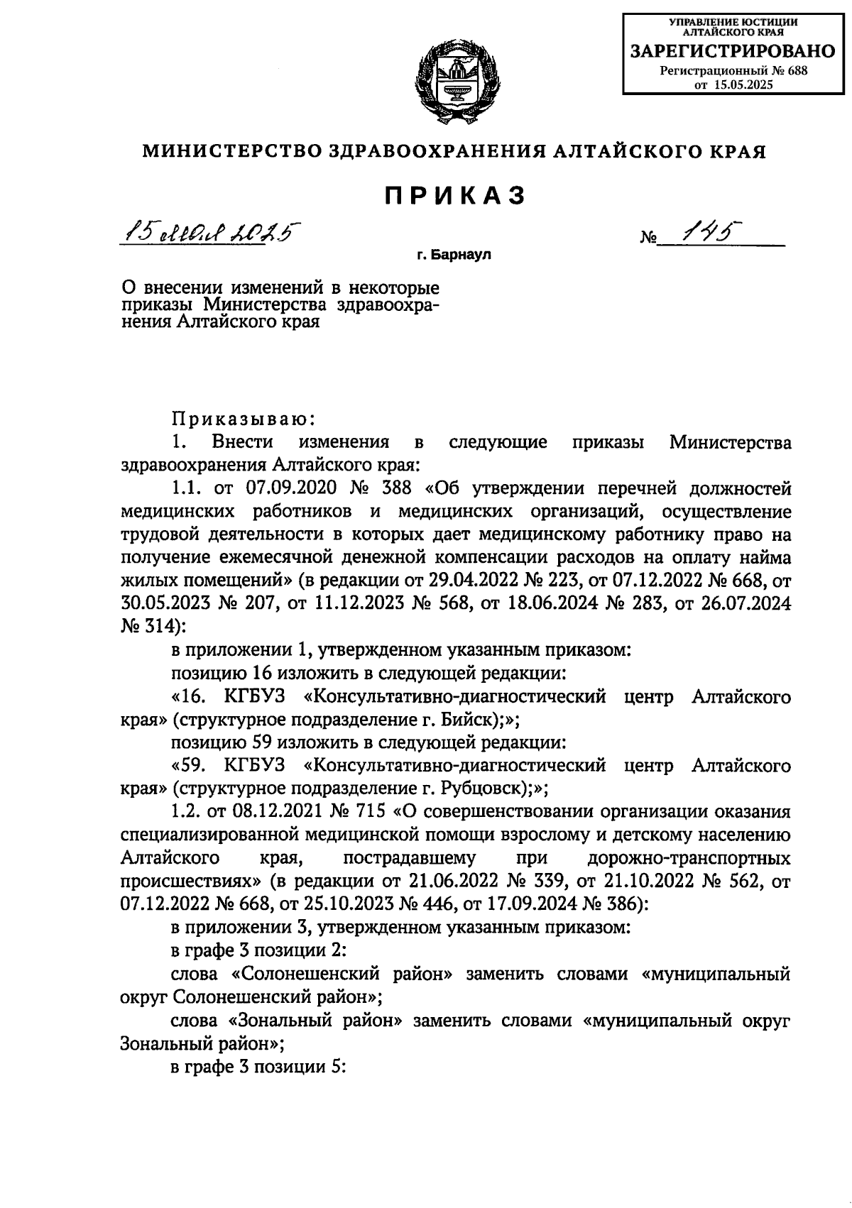 Приказ Министерства здравоохранения Алтайского края от 15.05.2025 № 145