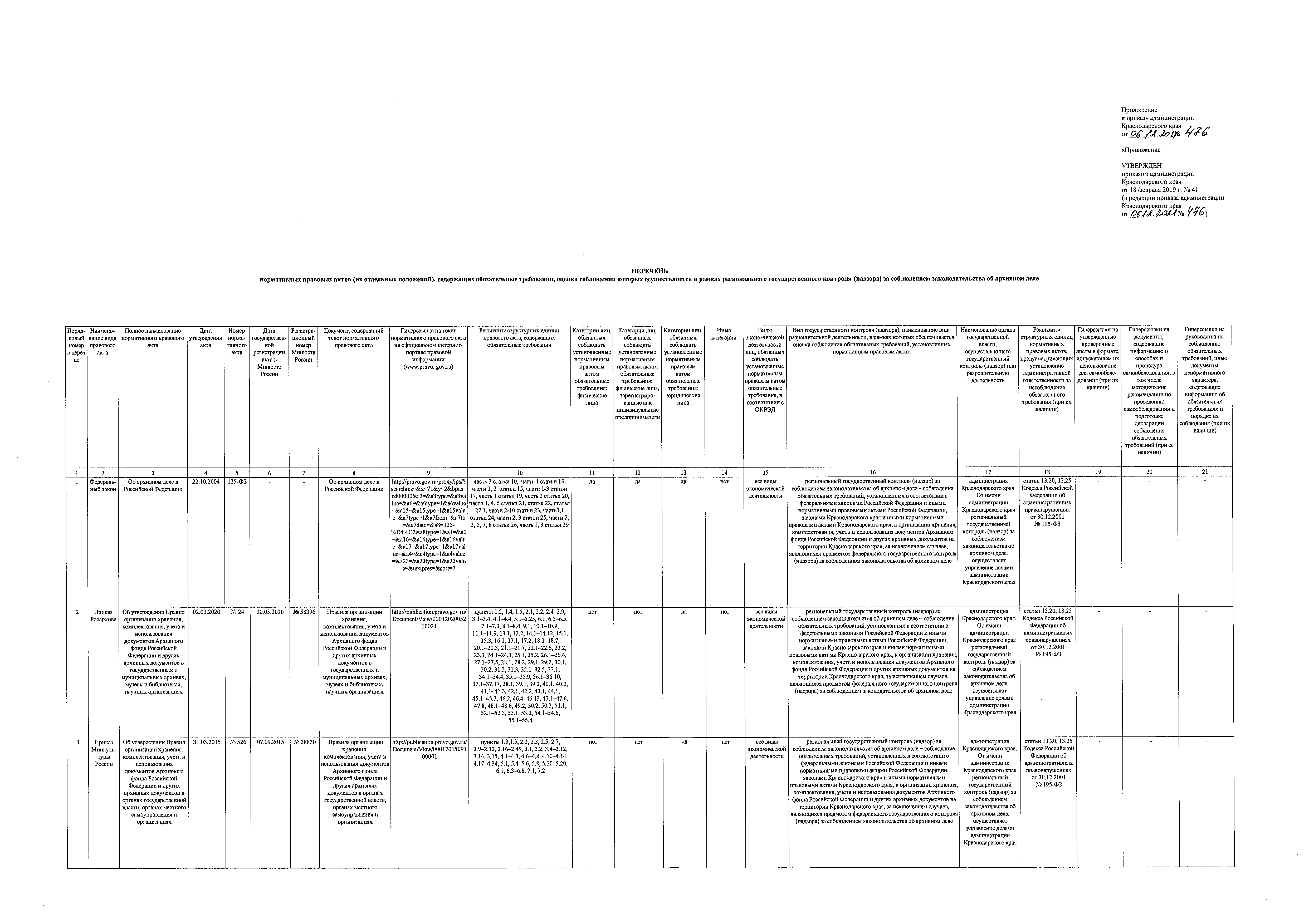 "О внесении изменений в приказ администрации Краснодарского края от 18 февраля 2019 г. № 41 "Об утверждении Перечня нормативных правовых актов, содержащих обязательные требования, соблюдение которых оценивается при осуществлении на территории Краснодарского края контроля за соблюдением законодательства об архивном деле в Российской Федерации, и порядка его ведения"