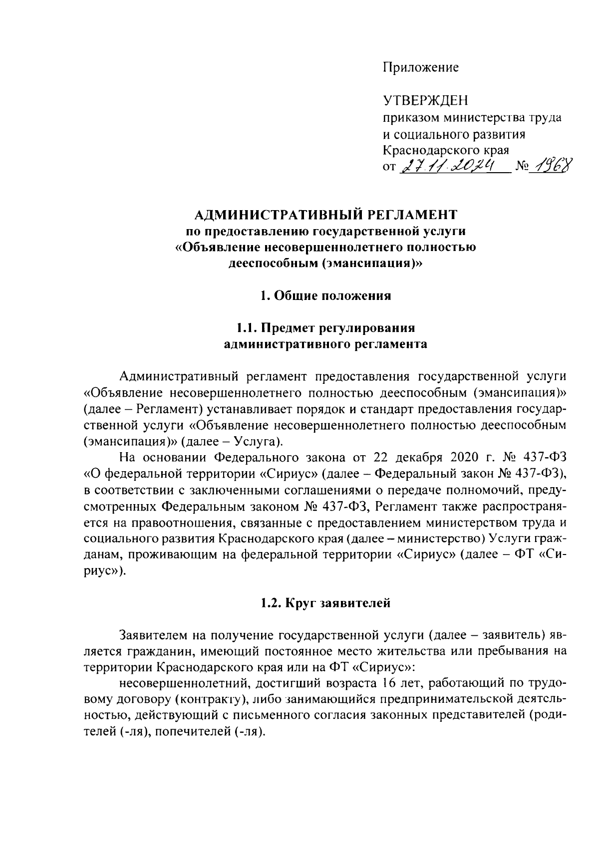 Приказ министерства труда и социального развития Краснодарского края от 27.11.2024 № 1968