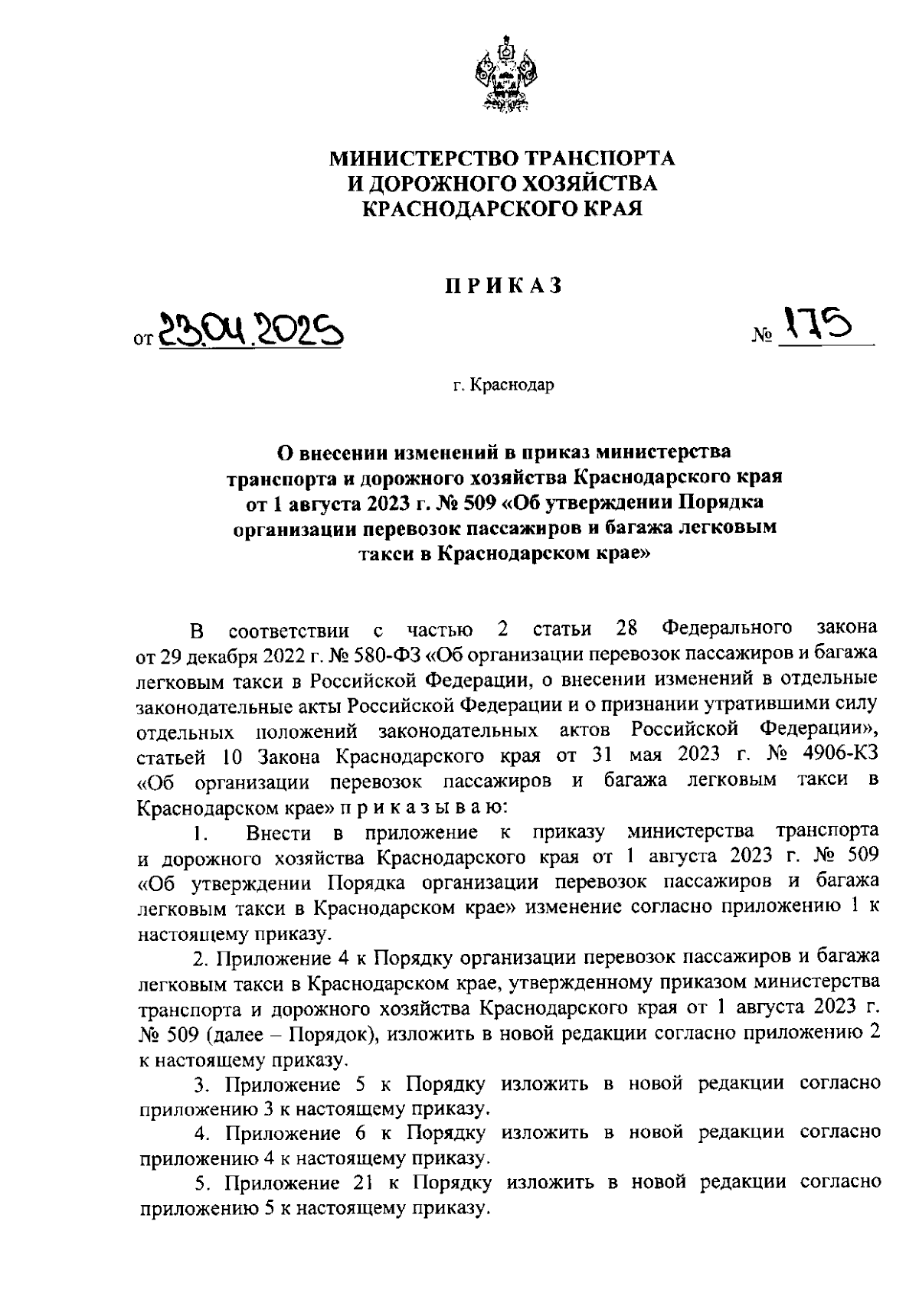 Приказ министерства транспорта и дорожного хозяйства Краснодарского края от 23.04.2025 № 175