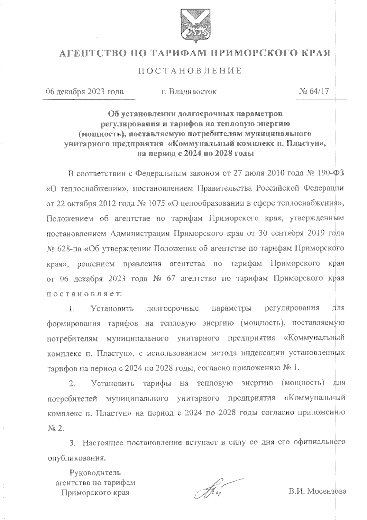 Постановление Агентства по тарифам Приморского края от 06.12.2023 № 64/17