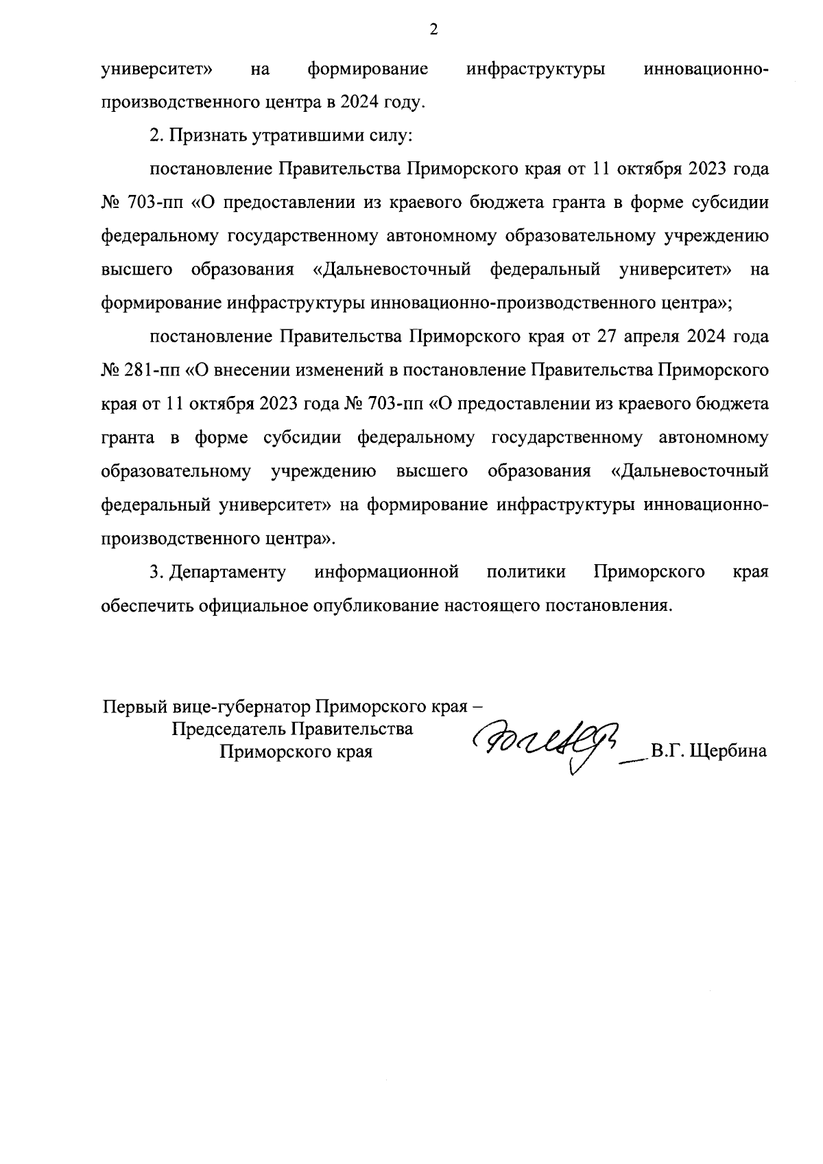 "О предоставлении из краевого бюджета гранта в форме субсидии федеральному государственному автономному образовательному учреждению высшего образования "Дальневосточный федеральный университет" на формирование инфраструктуры инновационно-производственного центра в 2024 году"