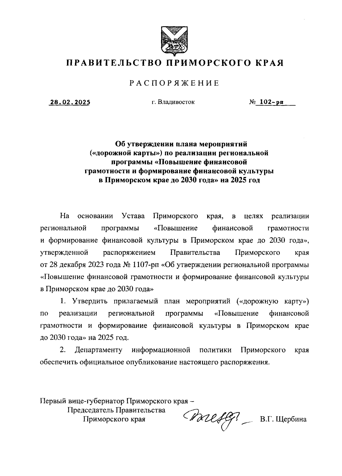 Распоряжение Правительства Приморского края от 28.02.2025 № 102-рп