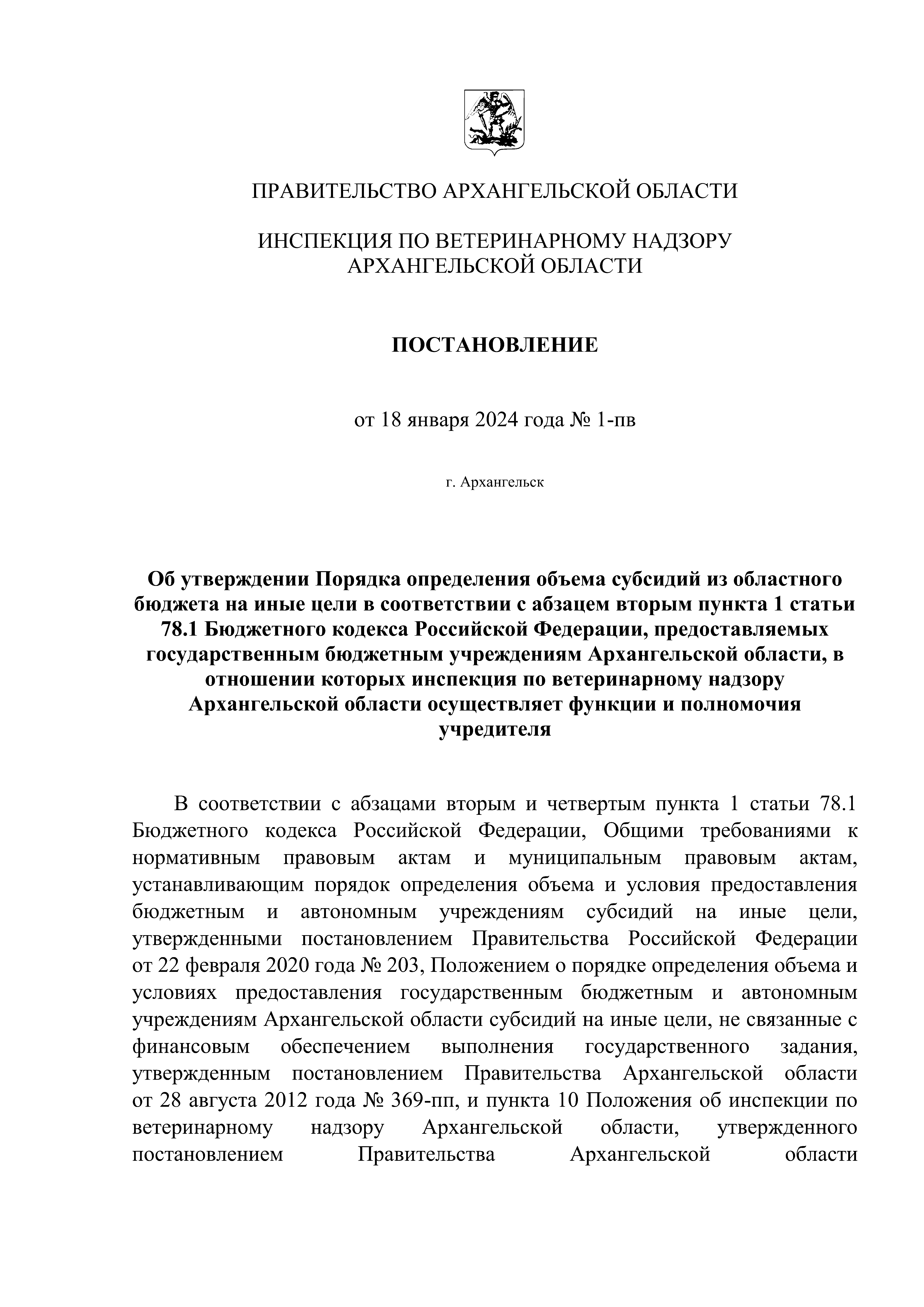 Постановление Инспекции по ветеринарному надзору Архангельской области от 18.01.2024 № 1-пв