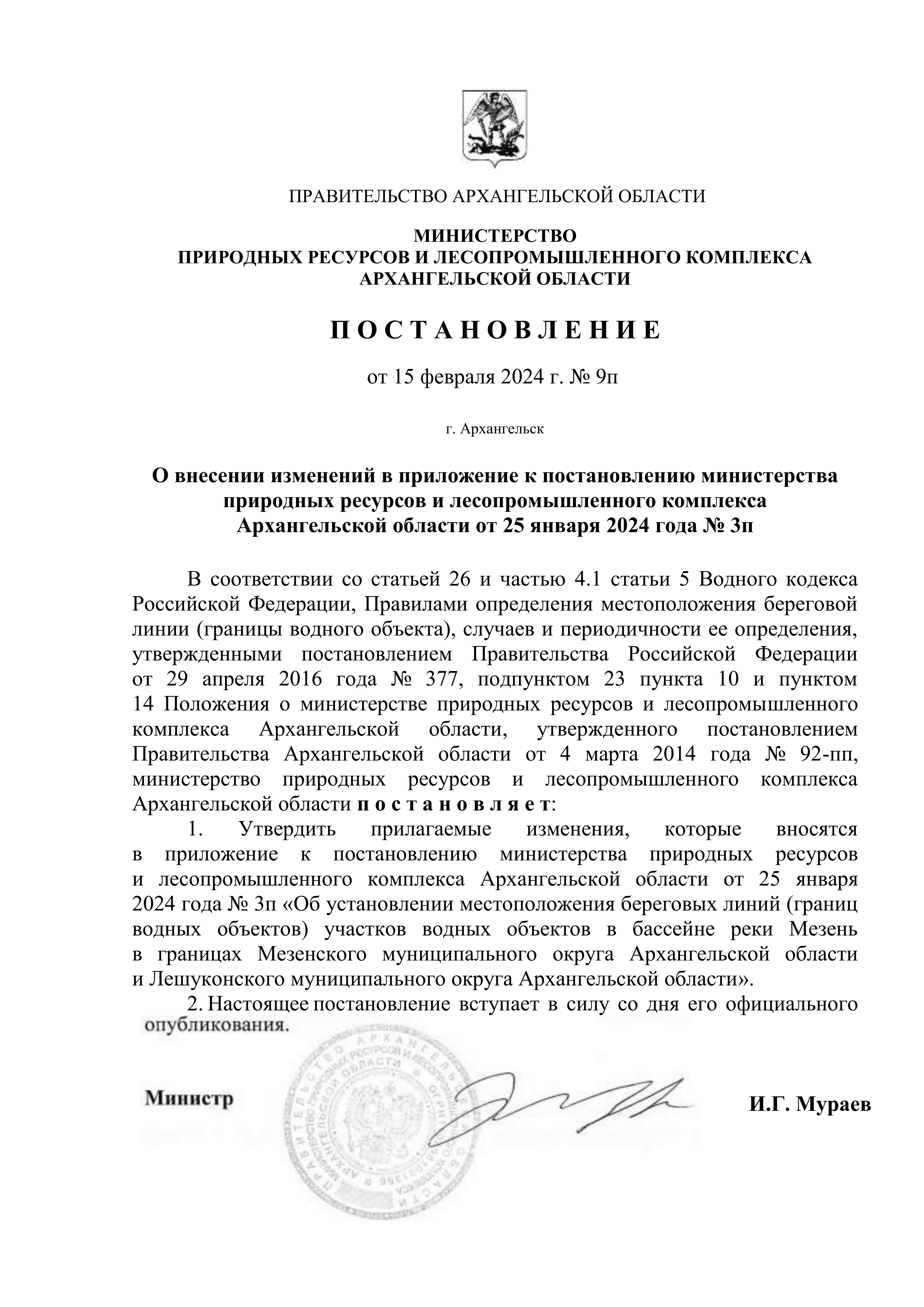 Постановление Министерства природных ресурсов и лесопромышленного комплекса Архангельской области от 15.02.2024 № 9п