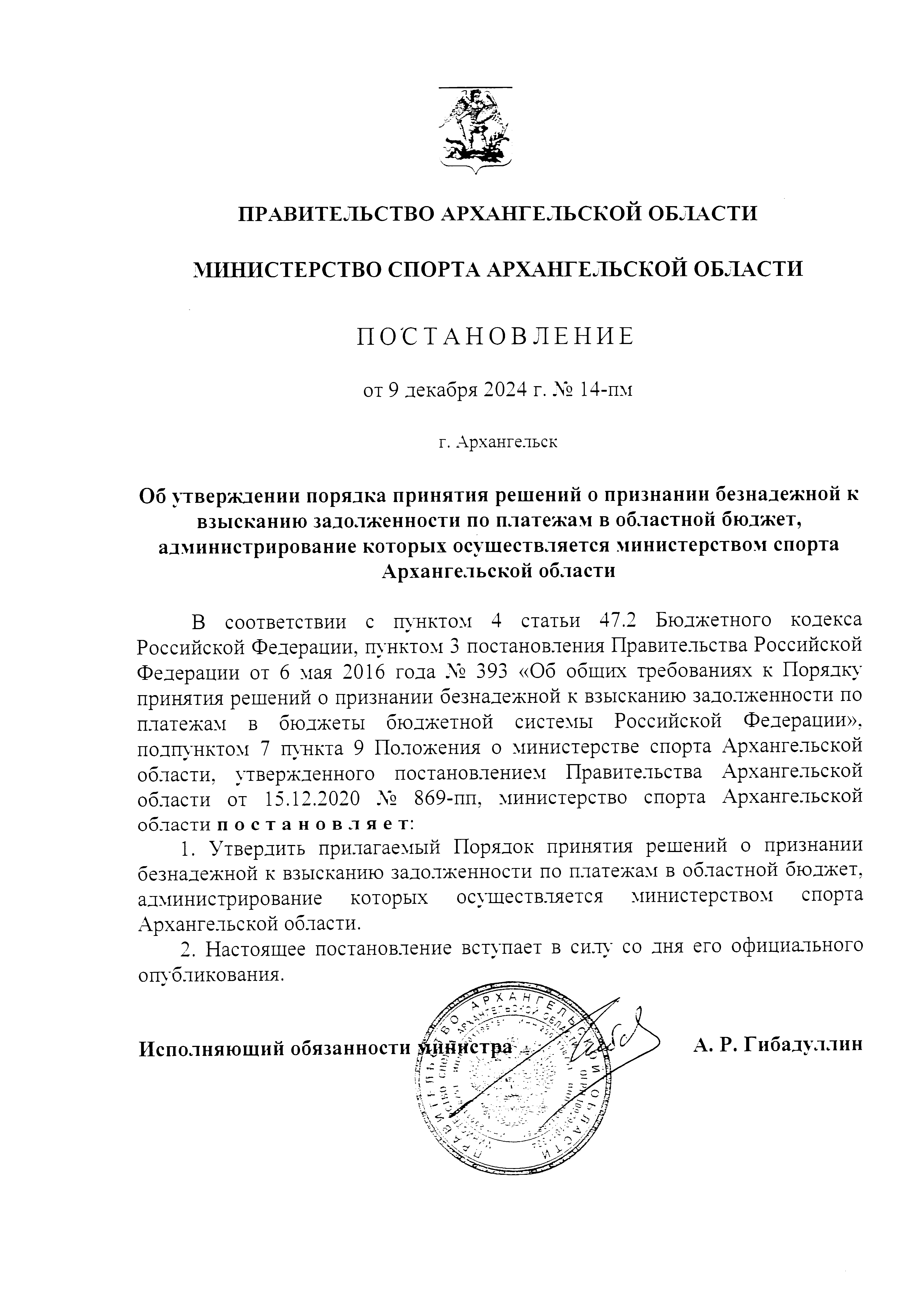 Постановление Министерства спорта Архагельской области от 09.12.2024 № 14-пм
