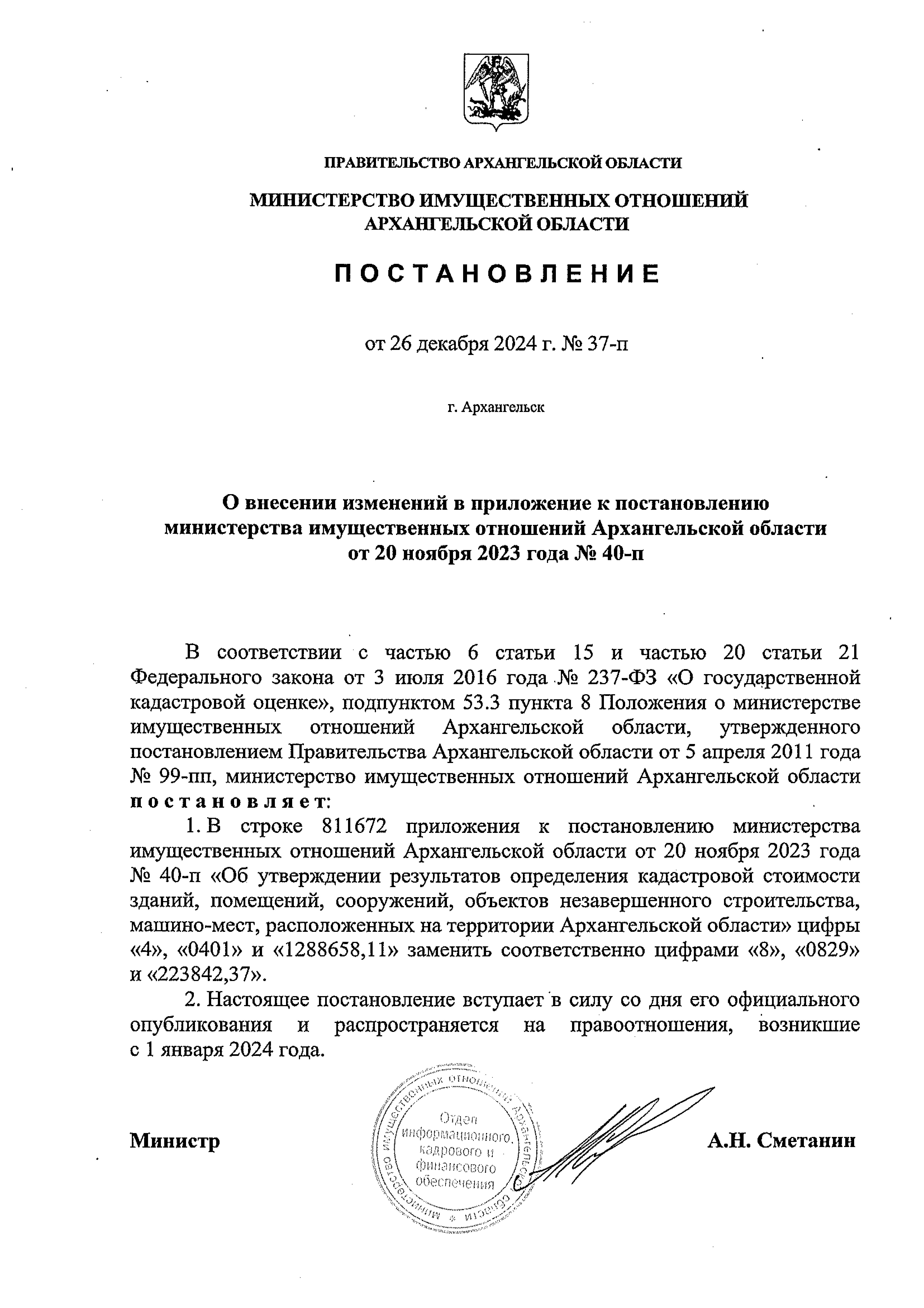 Постановление Министерства имущественных отношений Архангельской области от 26.12.2024 № 37-п