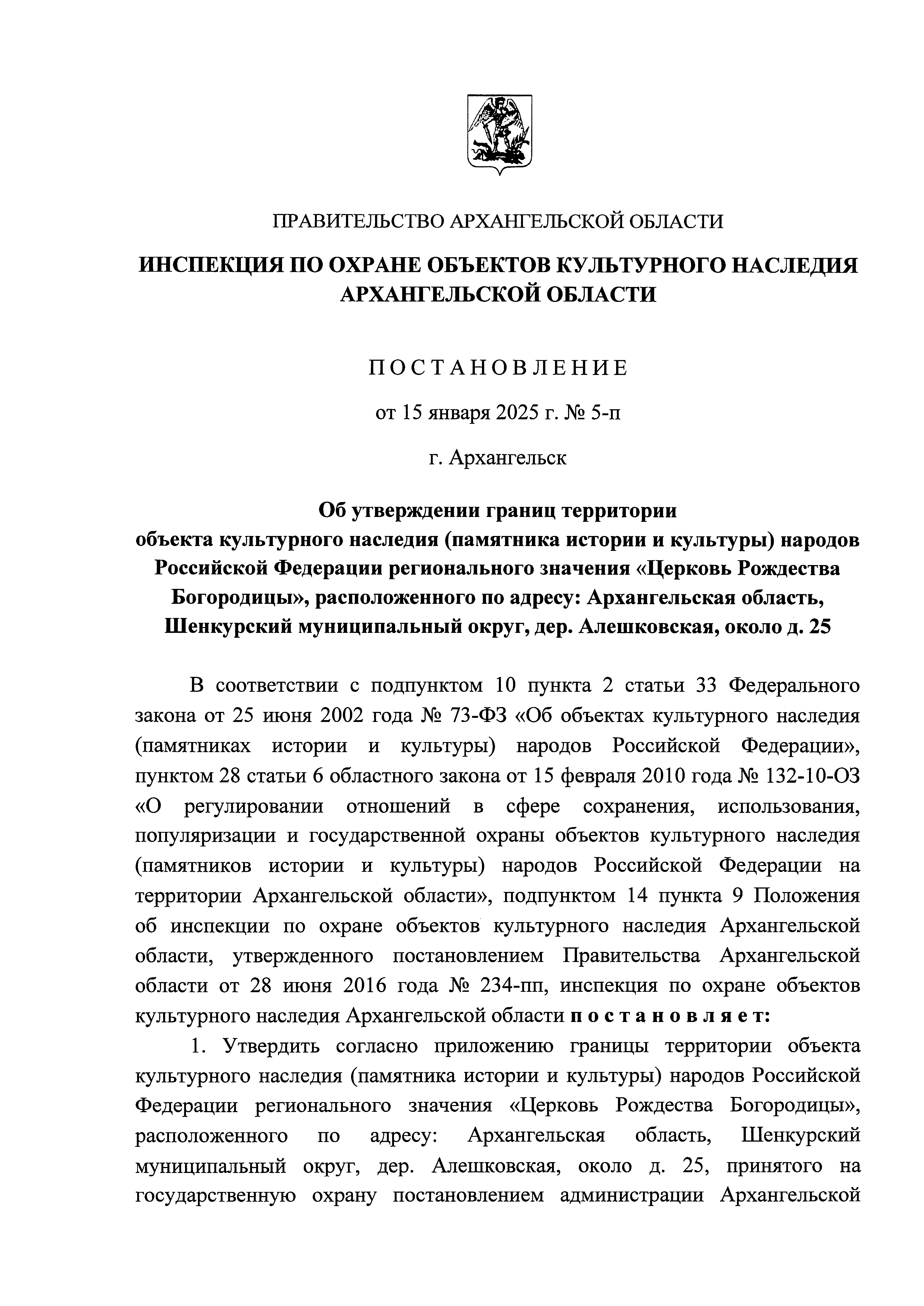 Постановление Инспекции по охране объектов культурного наследия Архангельской области от 15.01.2025 № 5-п
