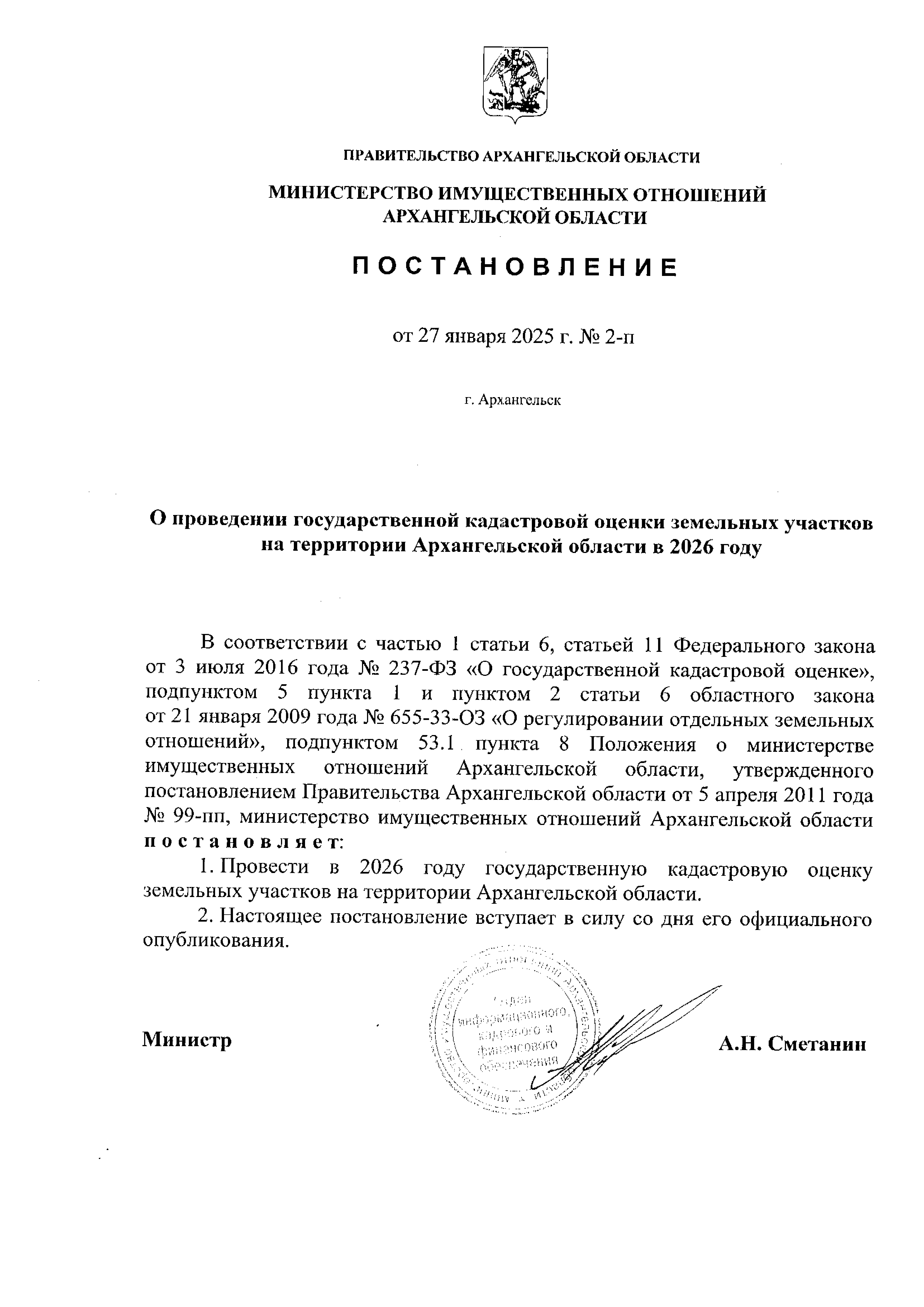 Постановление Министерства имущественных отношений Архангельской области от 27.01.2025 № 2-п
