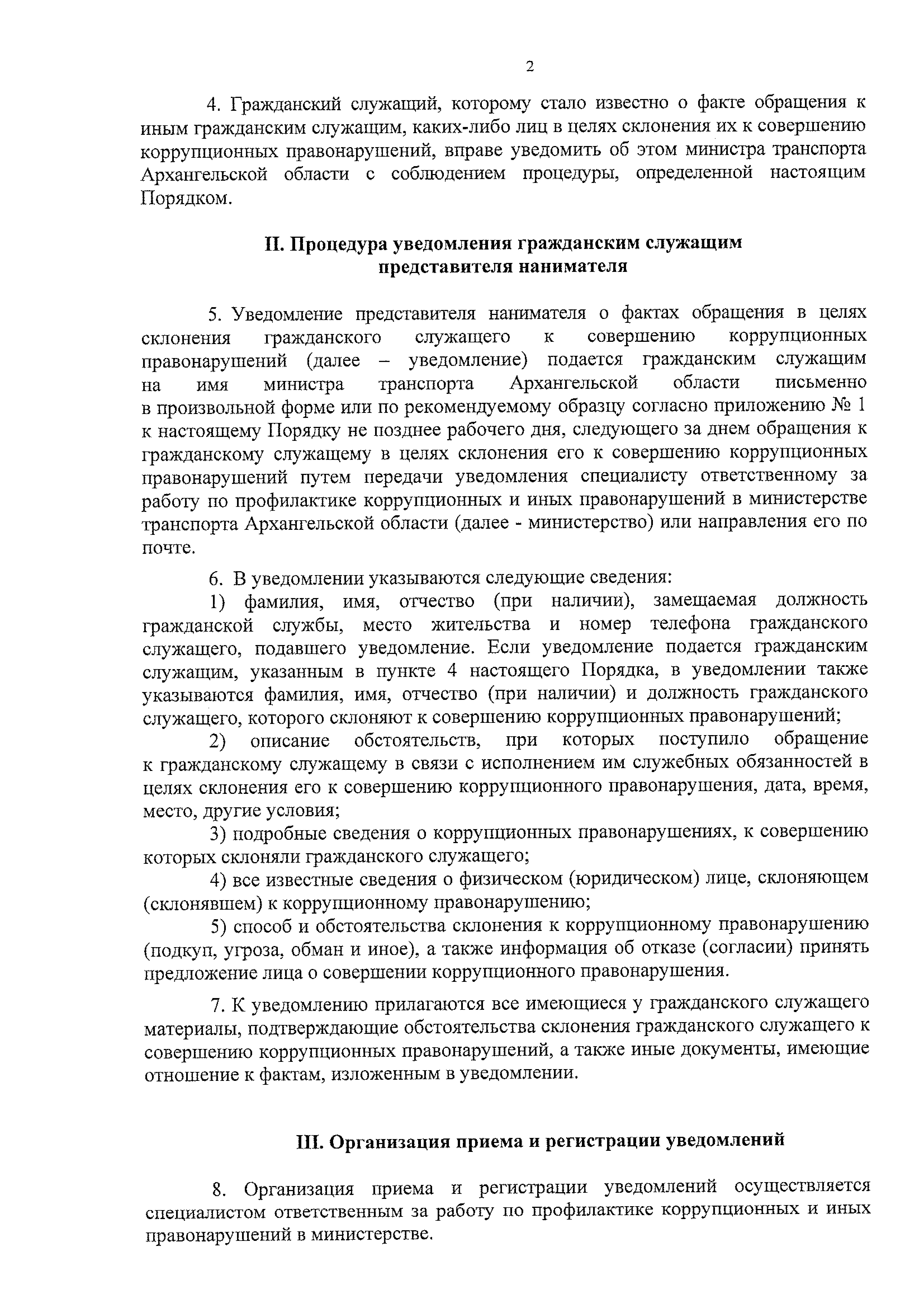 "Об утверждении Порядка уведомления представителя нанимателя о фактах обращения в целях склонения государственных гражданских служащих Архангельской области, замещающих должности государственной гражданской службы Архангельской области в министерстве транспорта Архангельской области, к совершению коррупционных правонарушений, регистрации таких уведомлений и проверки содержащихся в них сведений"