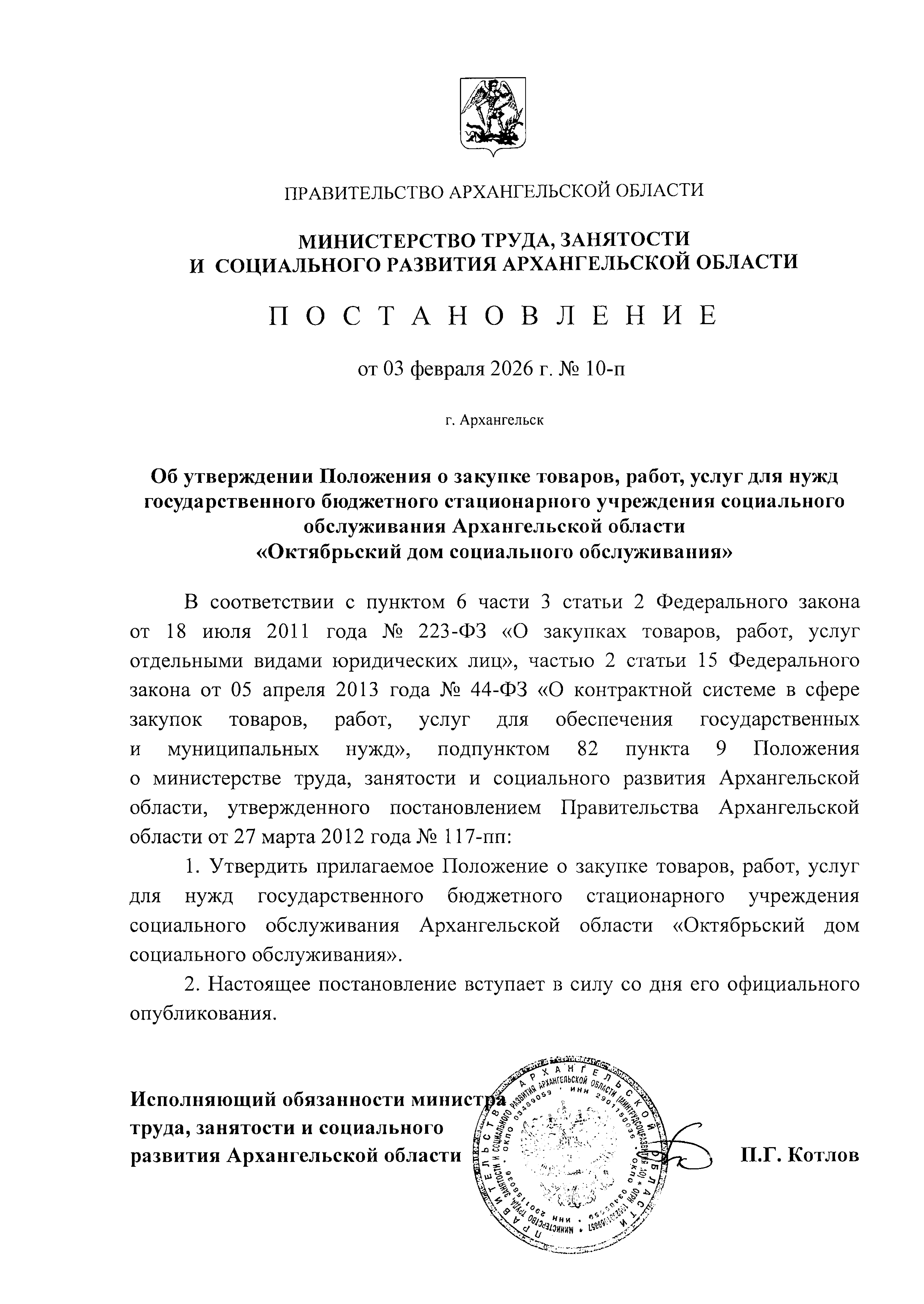 Постановление Министерства труда, занятости и социального развития Архангельской области от 03.02.2026 № 10-п