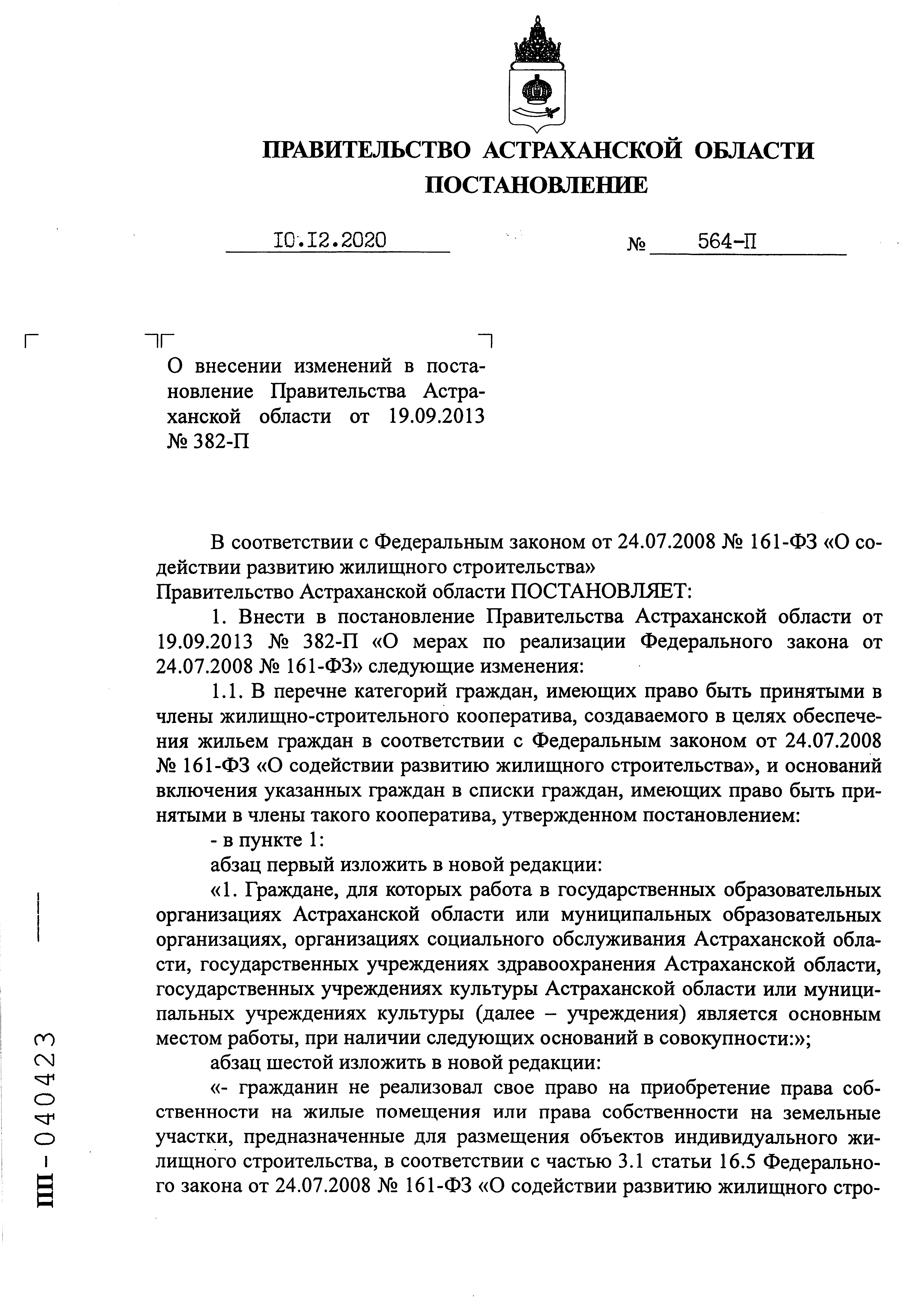 "О внесении изменений в постановление Правительства Астраханской области от 19.09.2013 № 382-П"