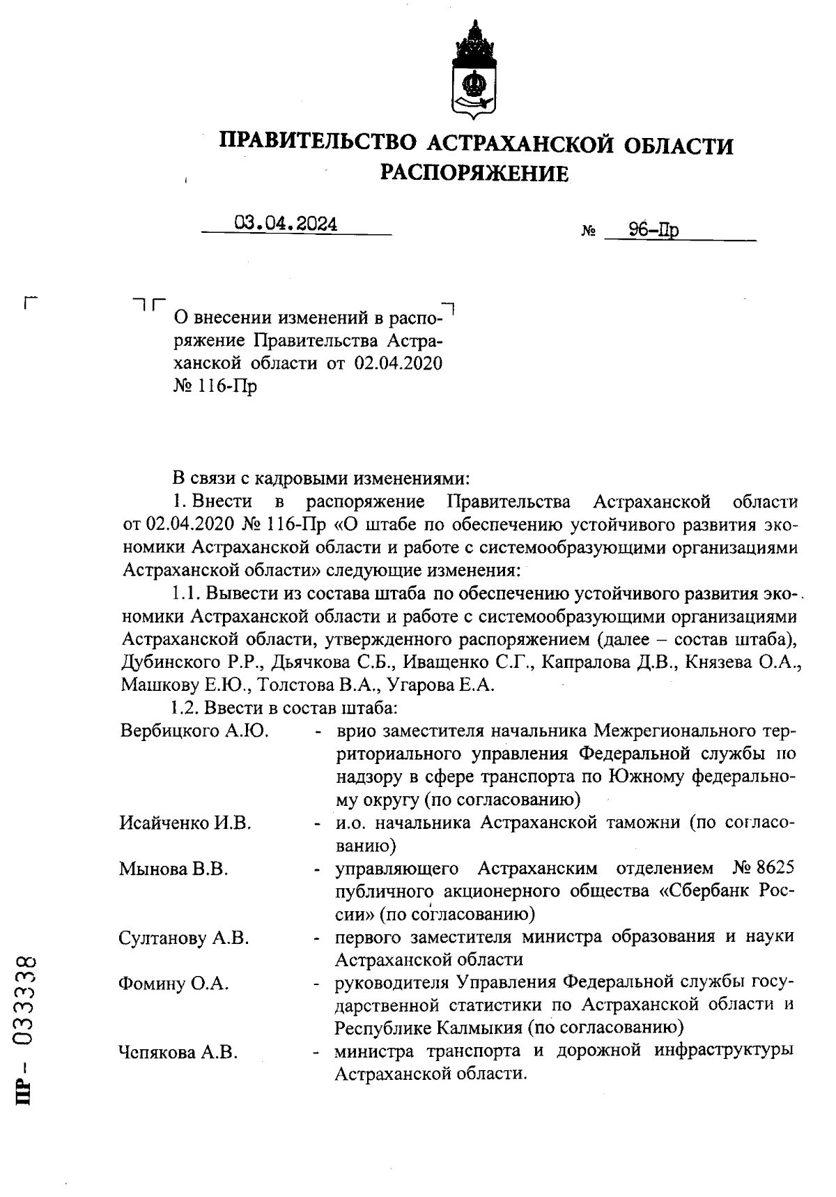Распоряжение Правительства Астраханской области от 03.04.2024 № 96-Пр