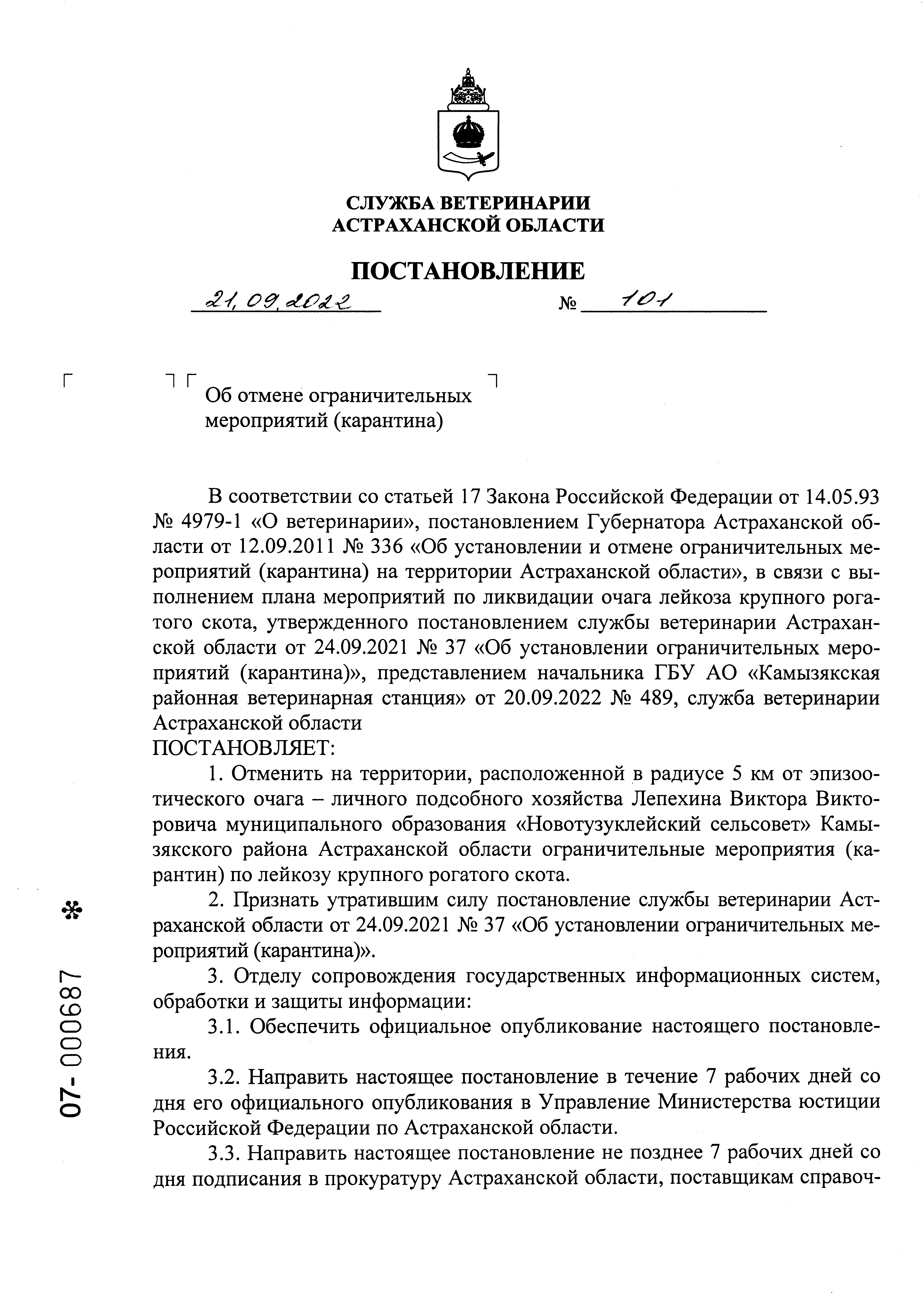 Постановление Службы ветеринарии Астраханской области от 21.09.2022 № 101