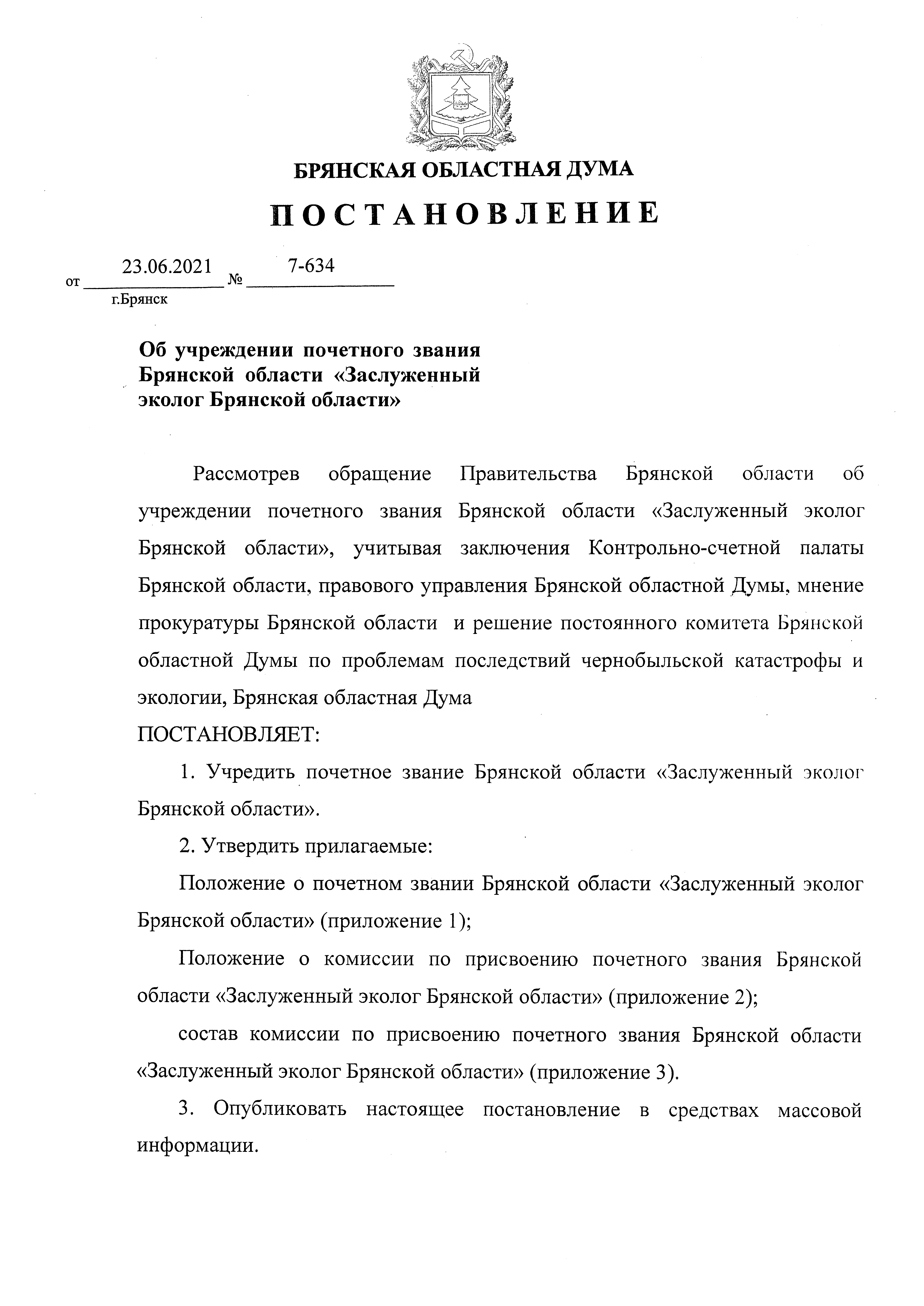 Постановление Брянской областной Думы от 23.06.2021 № 7-634