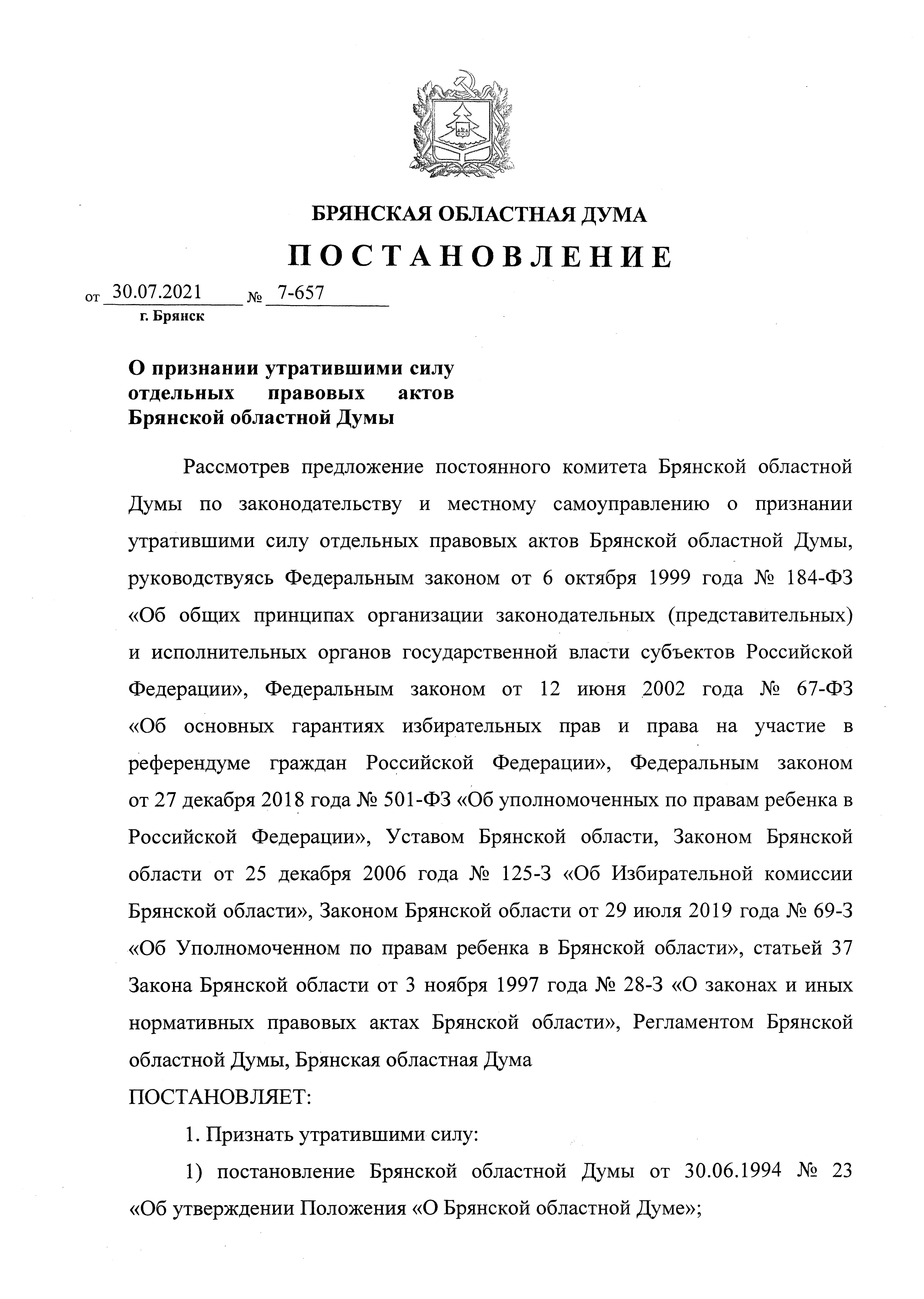 Постановление Брянской областной Думы от 30.07.2021 № 7-657