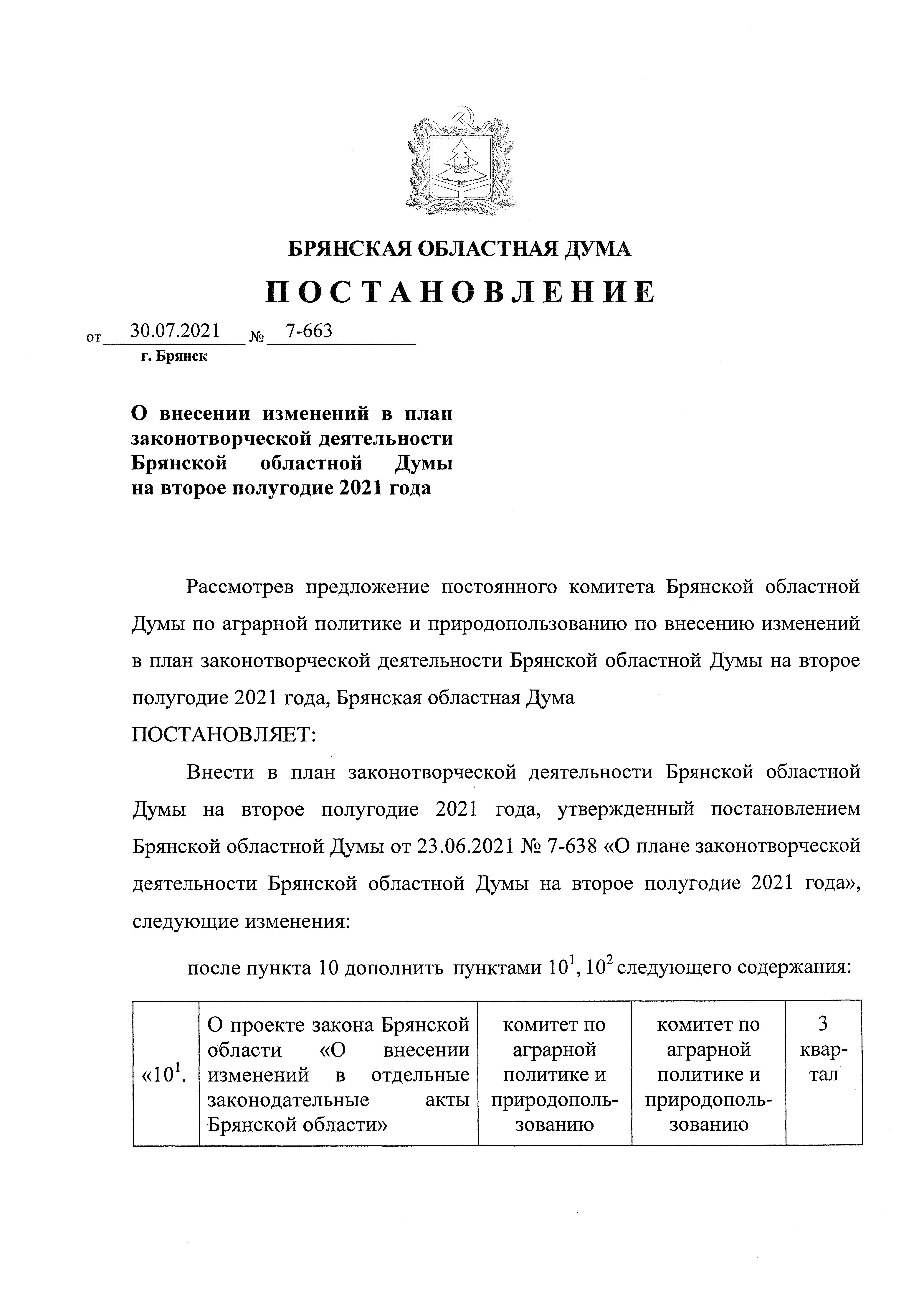 Постановление Брянской областной Думы от 30.07.2021 № 7-663