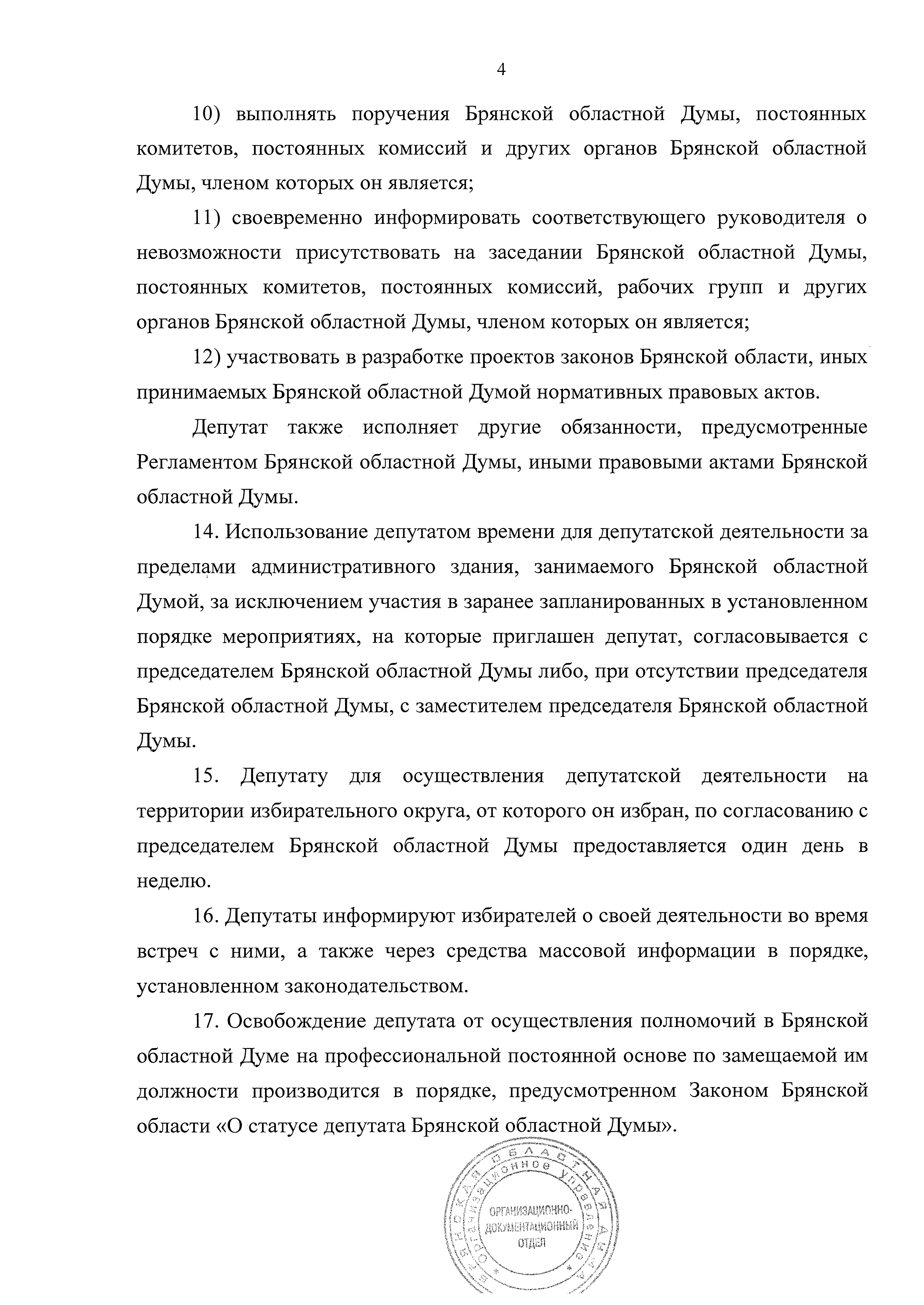 "О Положении об организации деятельности депутатов Брянской областной Думы, осуществляющих полномочия в Брянской областной Думе на профессиональной постоянной основе"