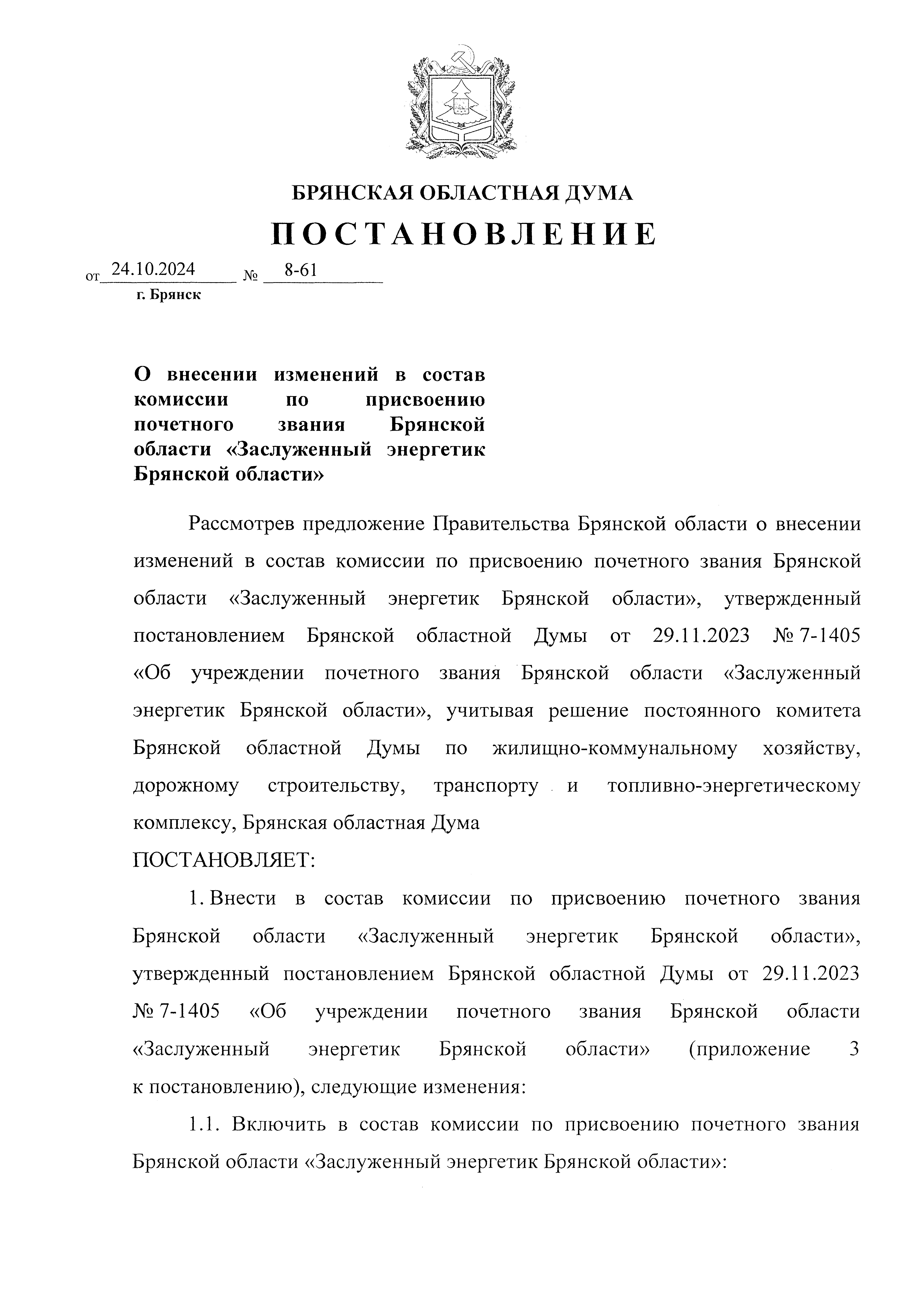 Постановление Брянской областной Думы от 24.10.2024 № 8-61