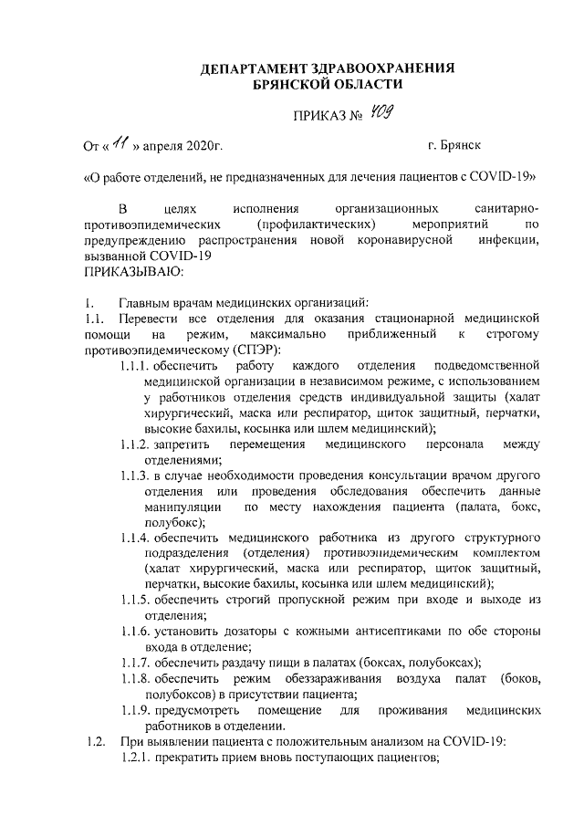 Приказ Департамента здравоохранения Брянской области от 11.04.2020 № 409