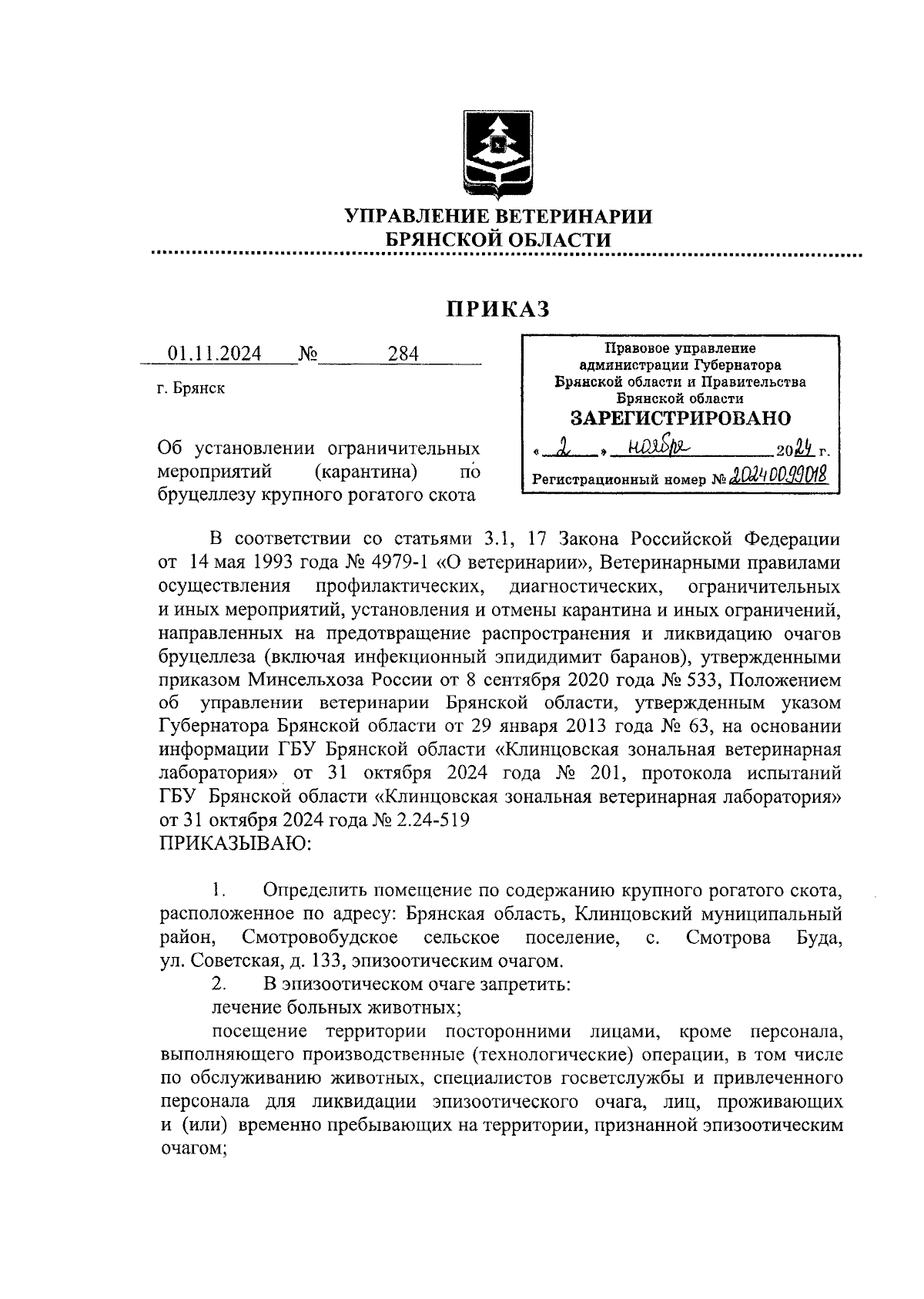 Приказ Управления ветеринарии Брянской области от 01.11.2024 № 284