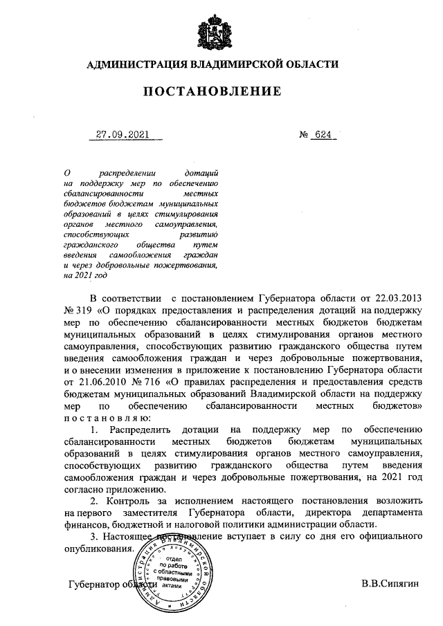 Постановление администрации Владимирской области от 27.09.2021 № 624