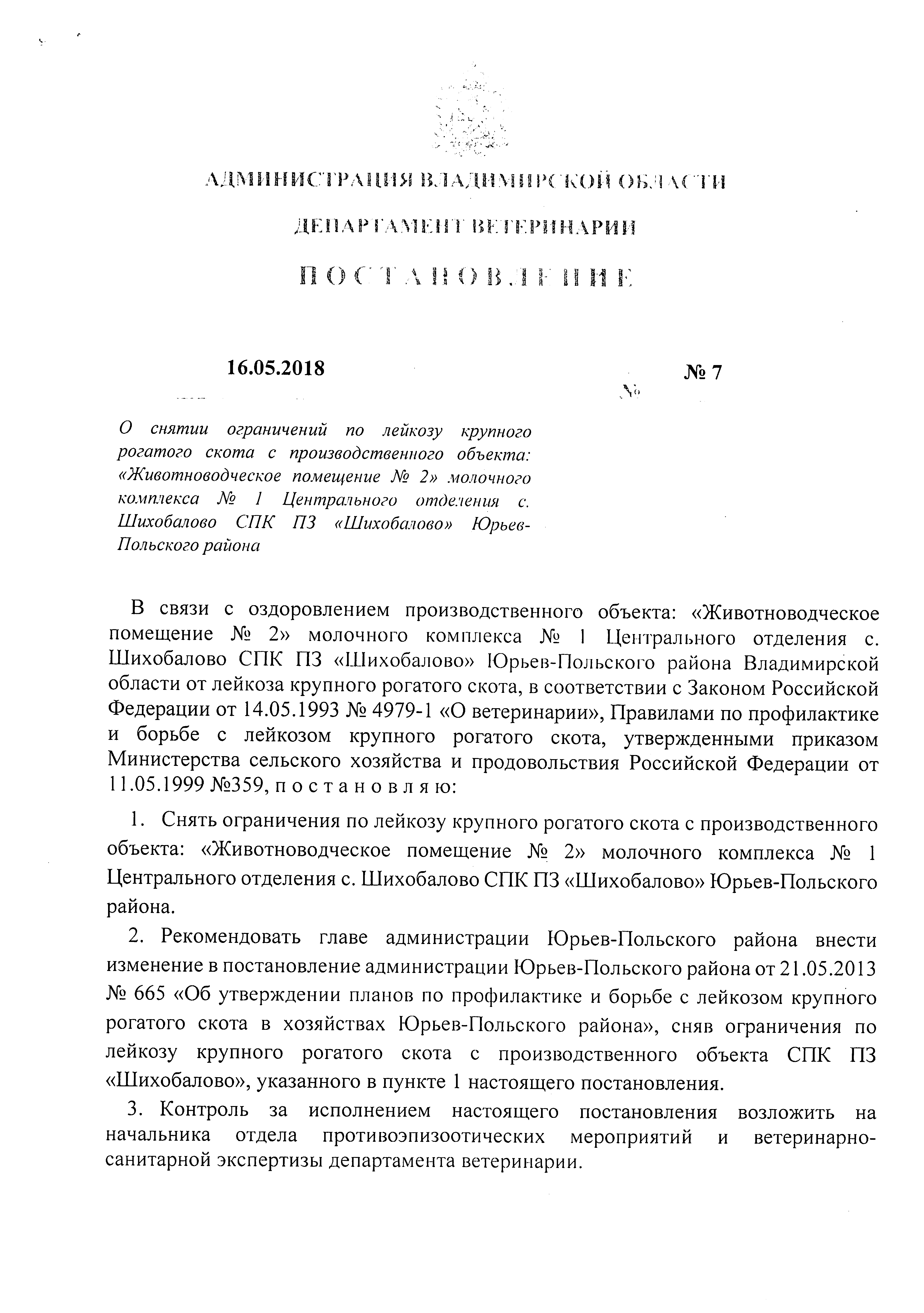"О снятии ограничений по лейкозу крупного рогатого скота с производственного объекта: "Животноводческое помещение №2" молочного комплекса №1 Центрального отделения с. Шихобалово СПК ПЗ "Шихобалово" Юрьев-Польского района"