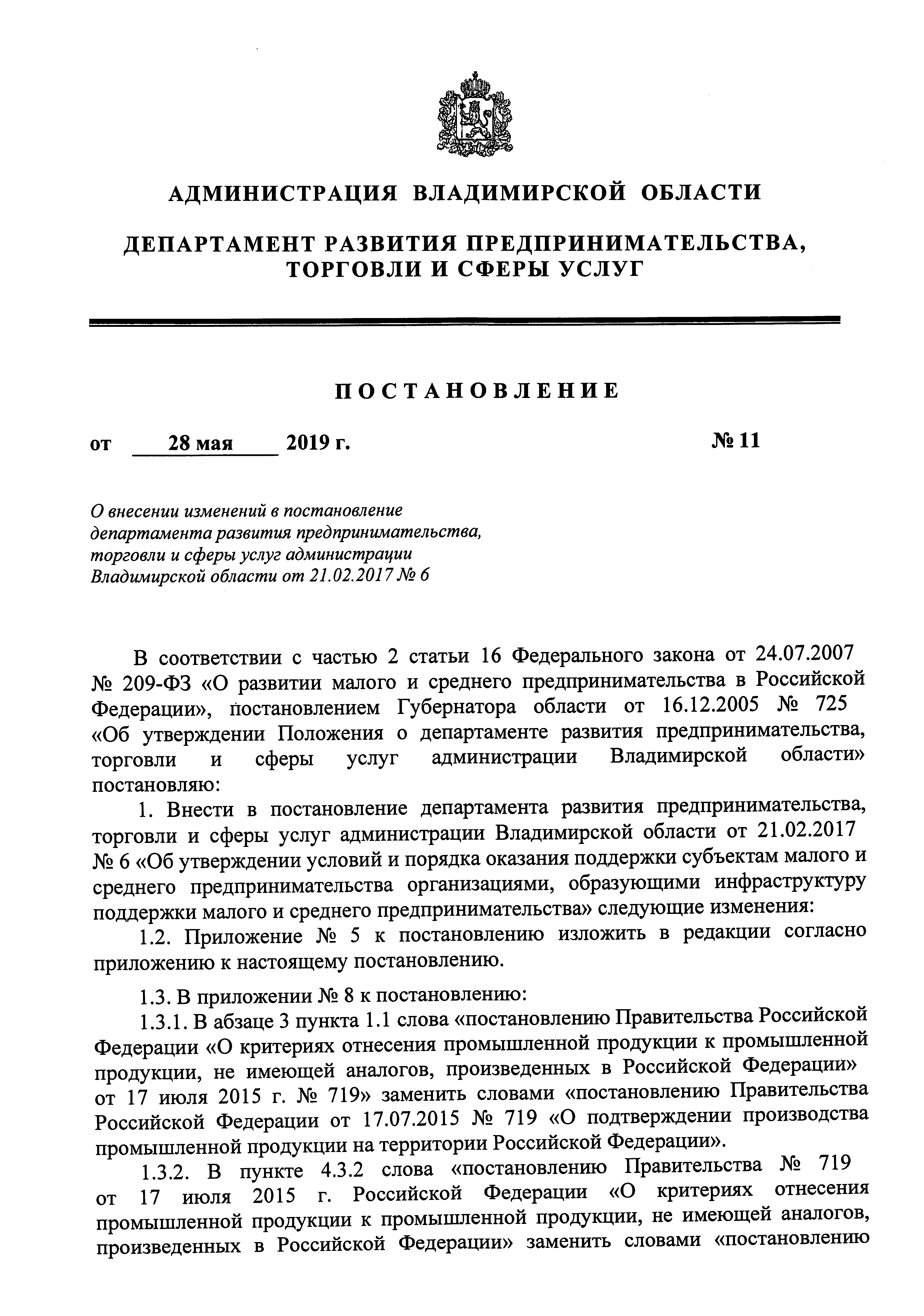 Постановление Департамента развития предпринимательства, торговли и сферы услуг Владимирской области от 28.05.2019 № 11