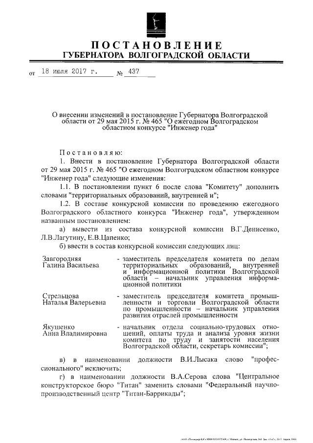 "О внесении изменений в постановление Губернатора Волгоградской области от 29 мая 2015 г. № 465 "О ежегодном Волгоградском областном конкурсе "Инженер года"