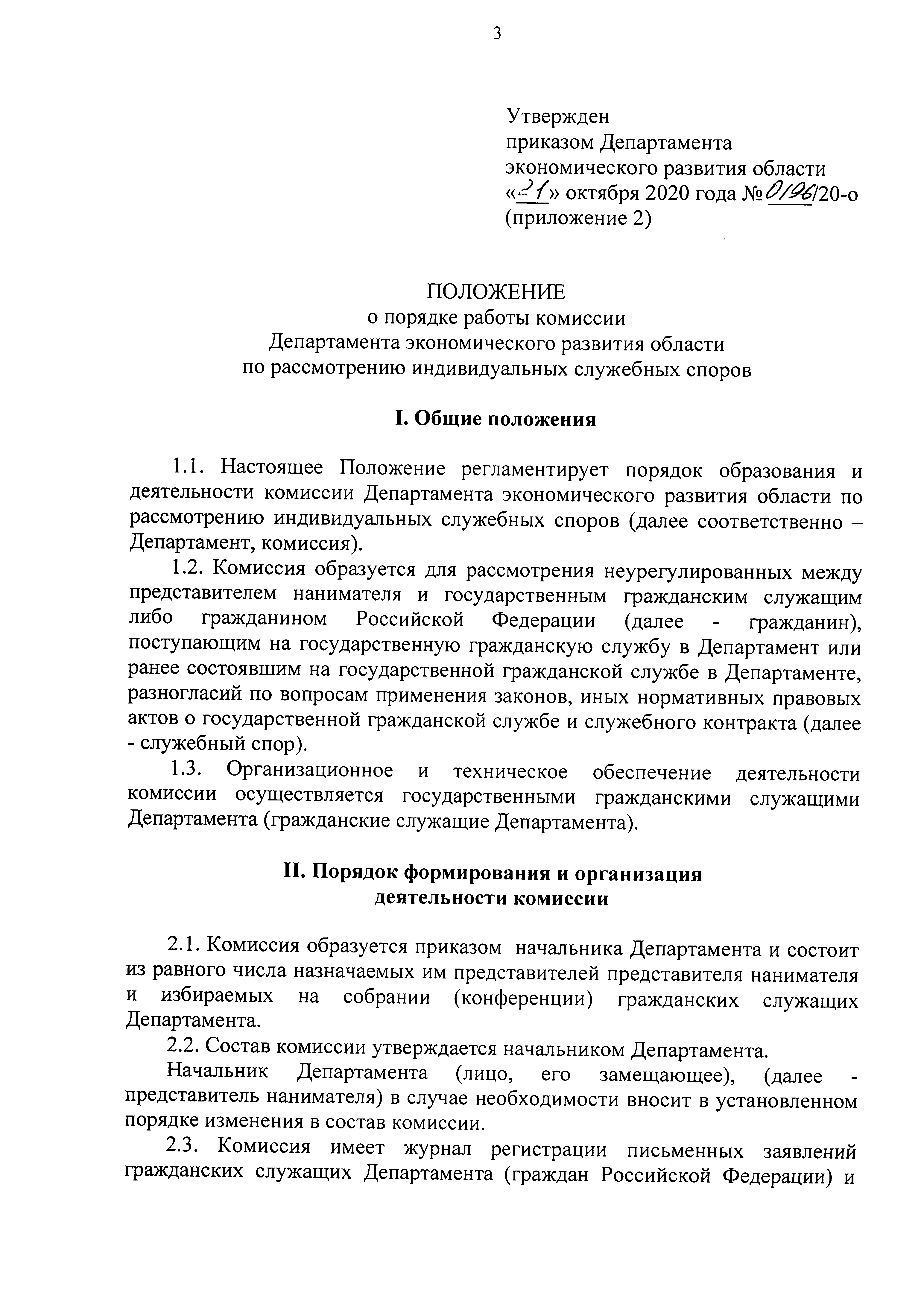 "О комиссии Департамента экономического развития области по рассмотрению индивидуальных служебных споров"