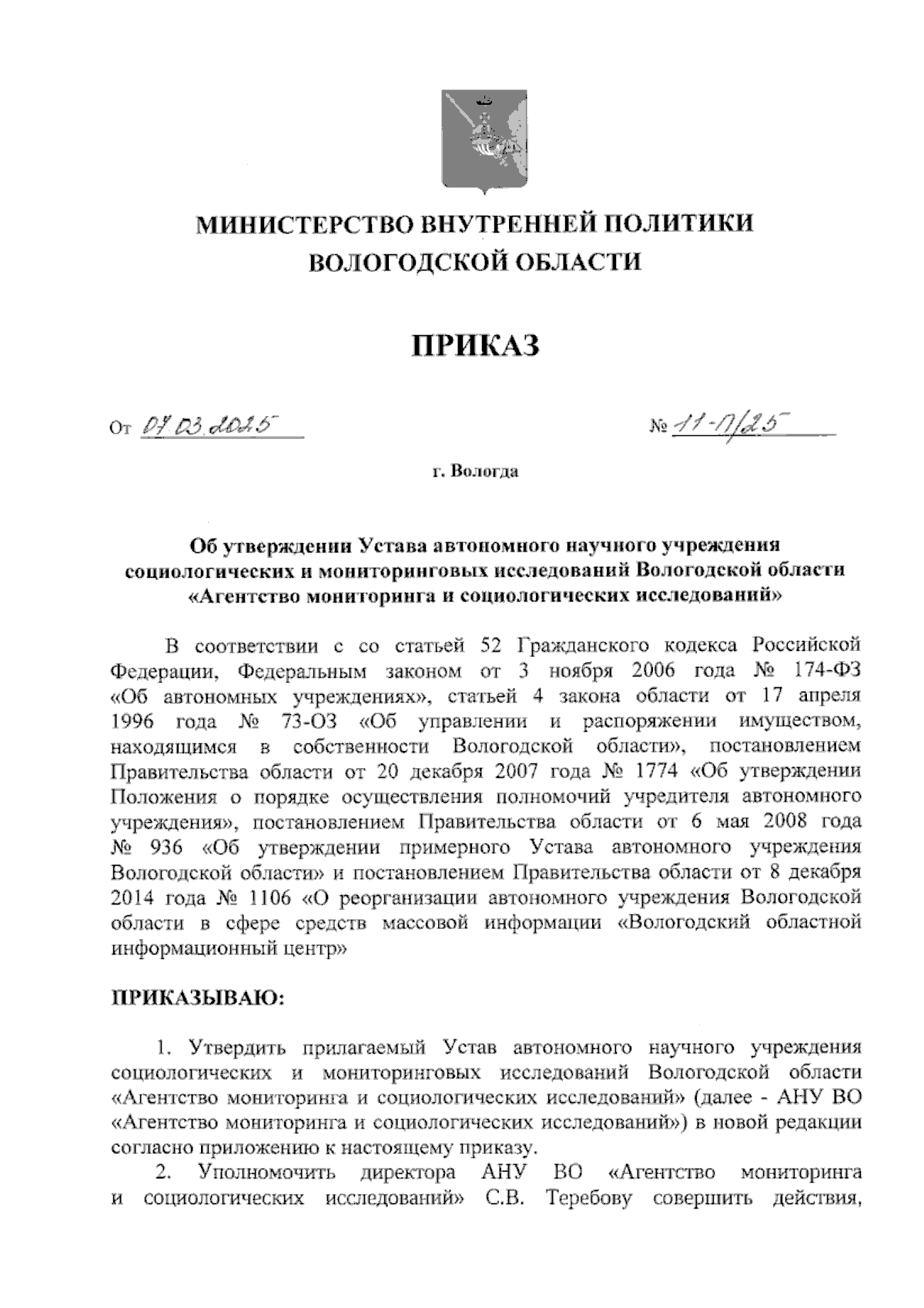 Приказ Министерства внутренней политики Вологодской области от 07.03.2025 № 11-П/25