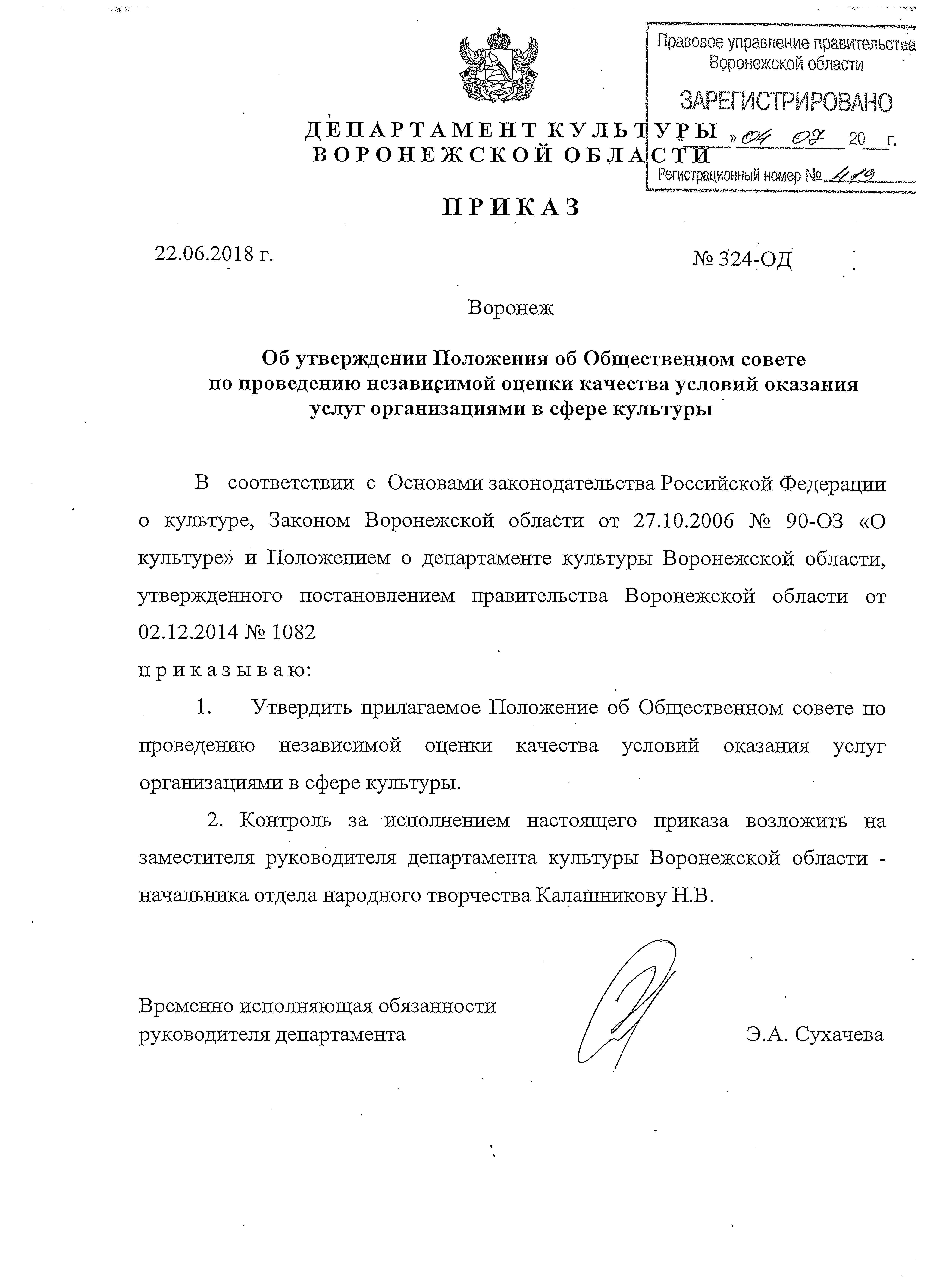 Приказ департамента культуры Воронежской области от 22.06.2018 № 324-ОД