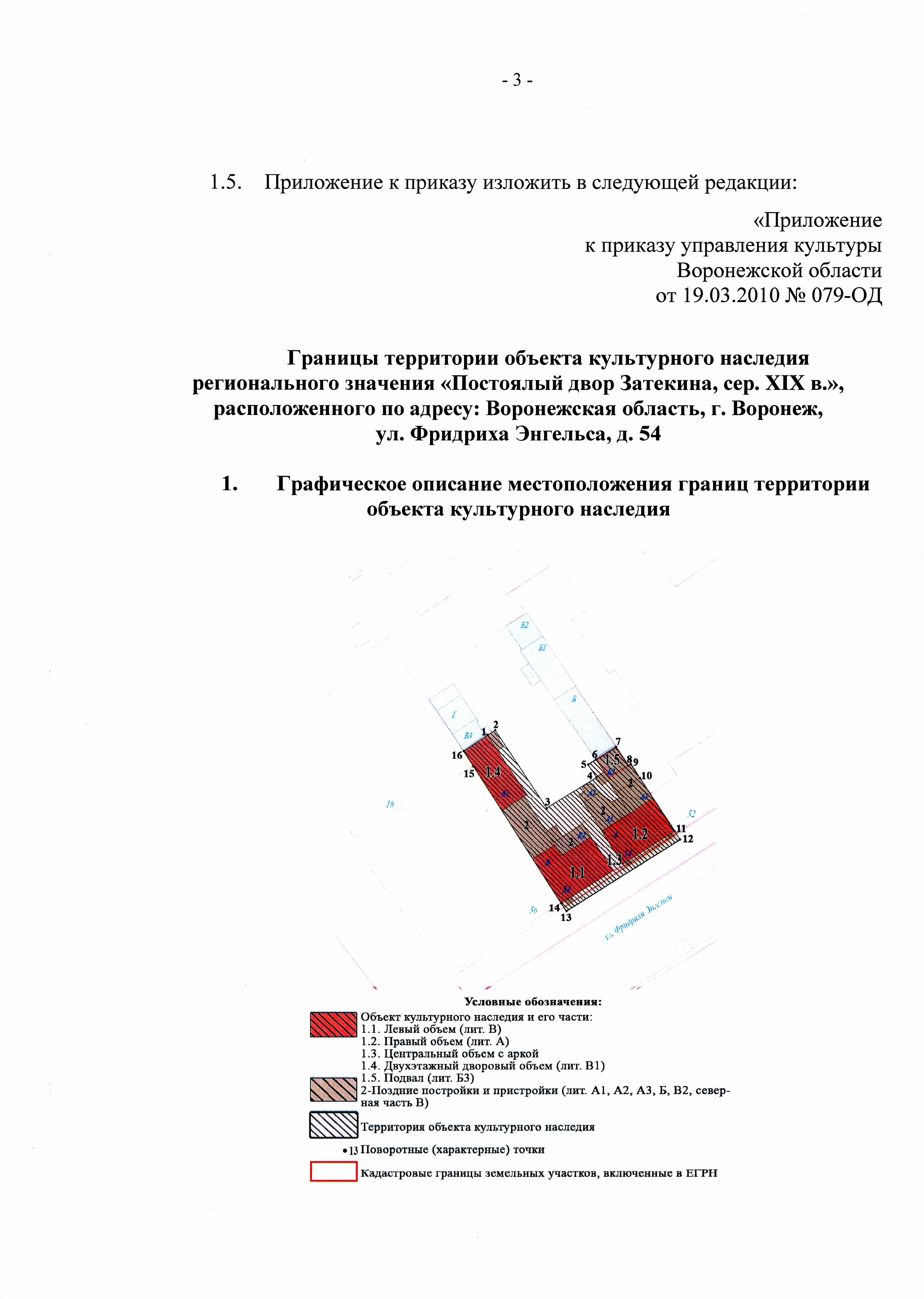 "О внесении изменений в приказ управления культуры Воронежской области от 19.03.2010 № 079-ОД "Об утверждении границ территории и требований к осуществлению деятельности в границах территории объекта культурного наследия регионального значения "Постоялый двор Затекина", расположенного по адресу: г. Воронеж, ул. Фридриха Энгельса, 54"