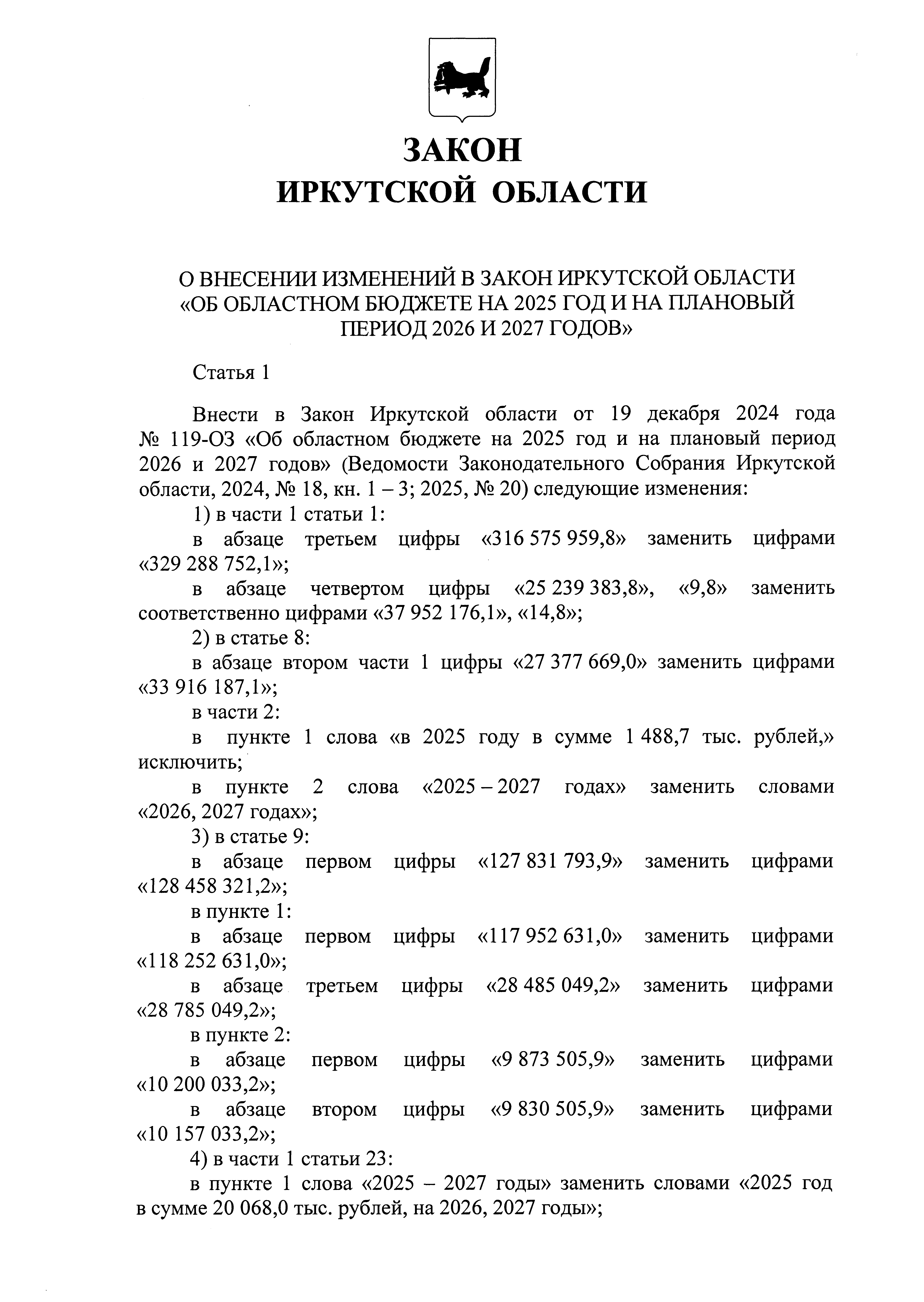 "О внесении изменений в Закон Иркутской области "Об областном бюджете на 2025 год и на плановый период 2026 и 2027 годов"